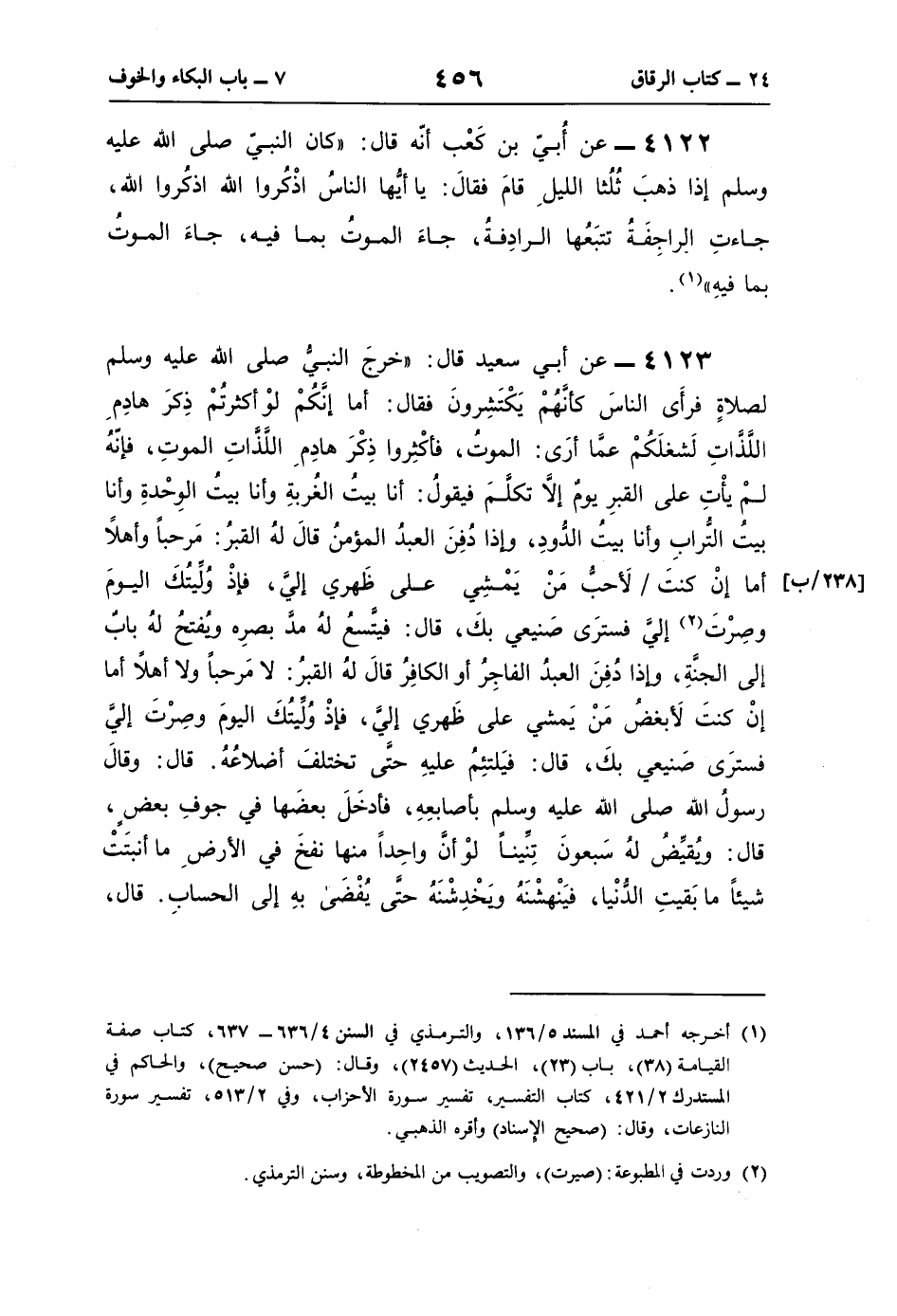 4122 - عن أُبيّ بن كَعْب أنّه قال: "كان النَّبيّ صلى اللَّه عليه وسلم إذا ذهبَ ثُلُثا الليلِ قامَ فقالَ: يا أيُّها النَّاسُ اذْكُروا اللَّه اذكُروا اللَّه، جاءتِ الراجِفَةُ تتبَعُها الرادِفةُ، جاءَ الموتُ بما فيه، جاءَ الموتُ بما فيهِ" (¬1).