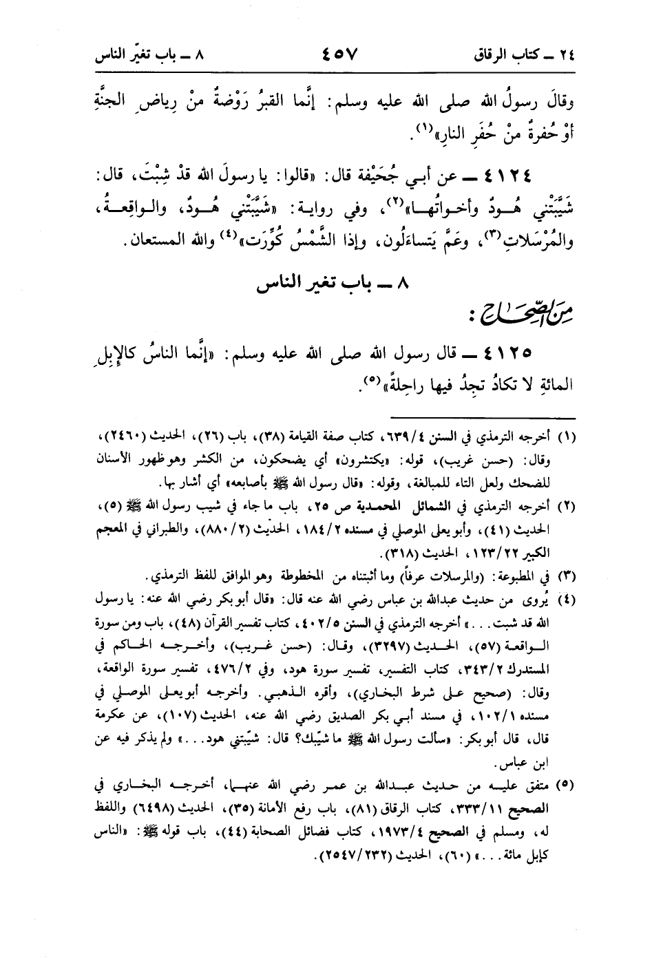 4124 - عن أبي جُحَيْفة قال: "قالوا: يا رسولَ اللَّه قدْ شِبْتَ، قال: شَيِّبَتْني هُودٌ وأخواتُها" (¬2)، وفي رواية: "شَيِّبَتْني هُودٌ، والواقِعةُ، والمُرْسَلاتِ (¬3)، وعَمَّ يَتساءَلُون، وإذا الشَّمْسُ كُوِّرَت" (¬4) واللَّه المستعان.
