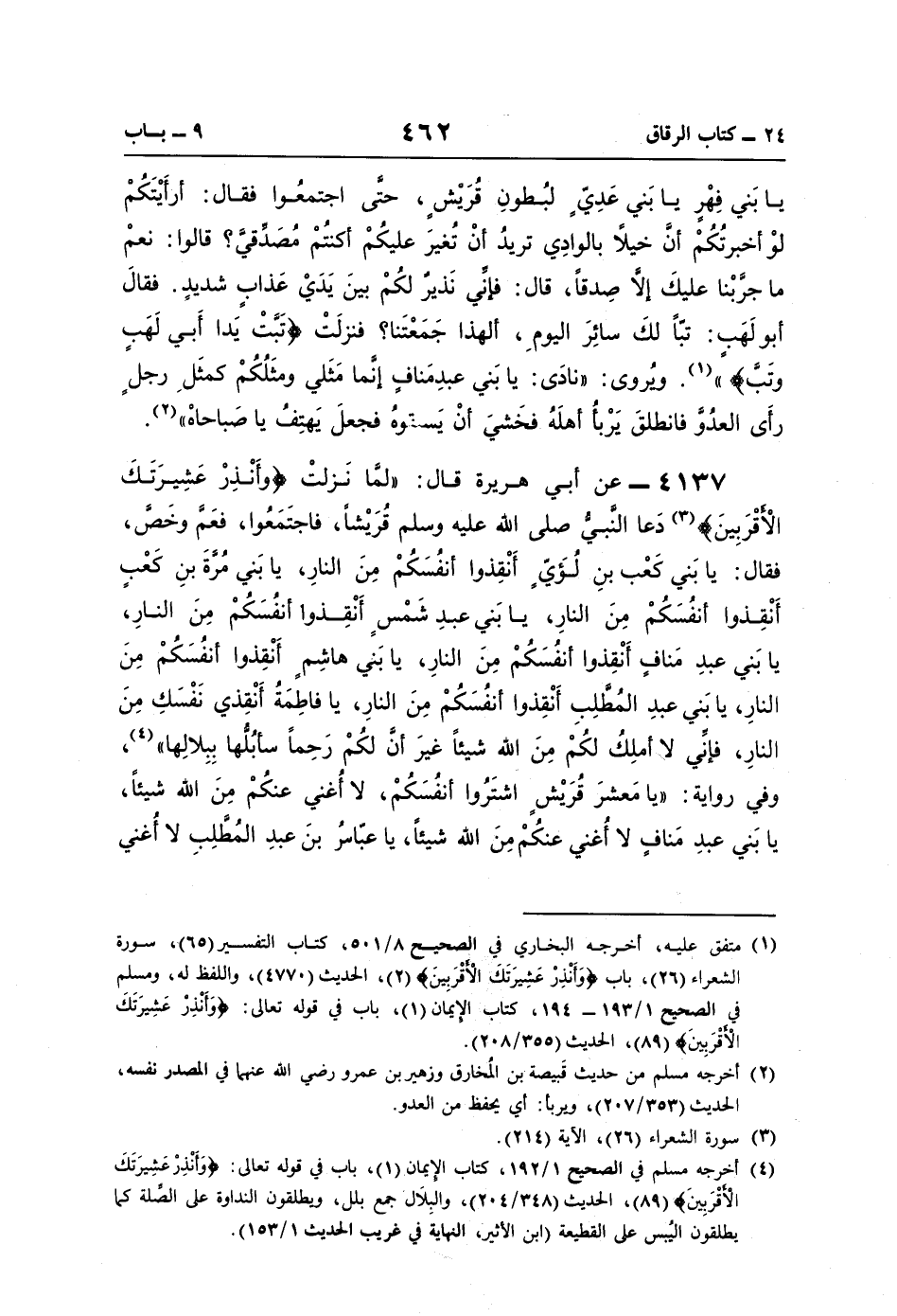 4137 - عن أبي هريرة قال: "لمَّا نَزلتْ {وَأَنْذِرْ عَشِيرَتَكَ الْأَقْرَبِينَ} (¬3) دَعا النَّبيُّ صلى اللَّه عليه وسلم قُرَيْشًا، فاجتَمَعُوا، فعَمَّ وخَصَّ، فقال: يا بَني كَعْب بنِ لُؤيٍّ أَنْقِذوا أنفُسَكُمْ مِنَ النَّارِ، يا بَني مُرَّةَ بنِ كَعْبٍ أَنْقِذوا أنفُسَكُمْ مِنَ النَّارِ، يا بَني عبدِ شَمْسٍ أَنْقِذوا أنفُسَكُمْ مِنَ النَّارِ، يا بَني عبدِ مَنافٍ أَنْقِذوا أنفُسَكُمْ مِنَ النَّارِ، يا بَني هاشِم أَنْقِذوا أنفُسَكُمْ مِنَ النَّارِ، يا بِني عبدِ المُطَّلِبِ أَنْقِذوا أنفُسَكُمْ مِنَ النَّارِ، يا فاطِمَةُ أَنْقِذي نَفْسَكِ مِنَ النَّارِ، فإنِّي لا أملِكُ لكُمْ مِنَ اللَّه شيئًا غيرَ أنَّ لكُمْ رَحِمًا سأبُلُّها بِبِلالِها" (¬4)، وفي رواية: "يا مَعشرَ قُرَيْش اشتَرُوا أنفُسَكُمْ، لا أُغني عنكُمْ مِنَ اللَّه شيئًا، يا بَني عبدِ مَنافٍ لا أُغني عنكُمْ مِنَ اللَّه شيئًا، يا عبّاسُ بنَ عبدِ المُطَّلِبِ لا أُغني