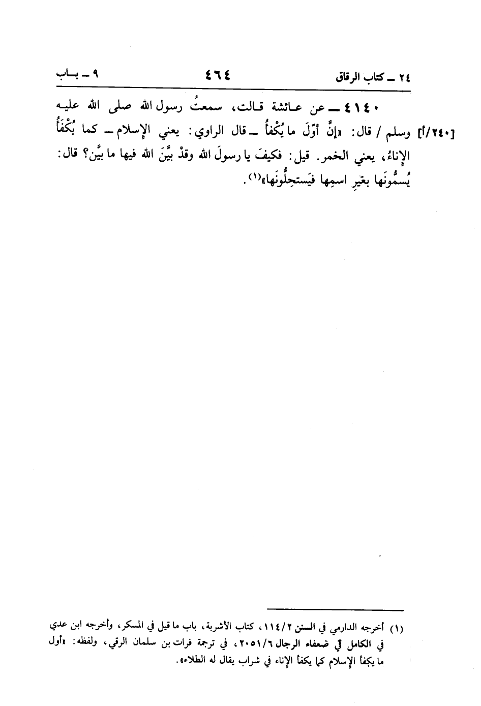 4140 - عن عائشة قالت، سمعتُ رسول اللَّه صلى اللَّه عليه وسلم قال: "إنَّ أوّلَ ما يُكْفأُ -قال الراوي: يعني الإِسلام- كما يُكْفَأُ الإِناءُ، يعني الخمر. قيل: فكيفَ يا رسولَ اللَّه وقدْ بيَّنَ اللَّه فيها ما بيِّن؟ قال: يُسمُّونَها بغيرِ اسمِها فيَستحِلُّونَها" (¬1).