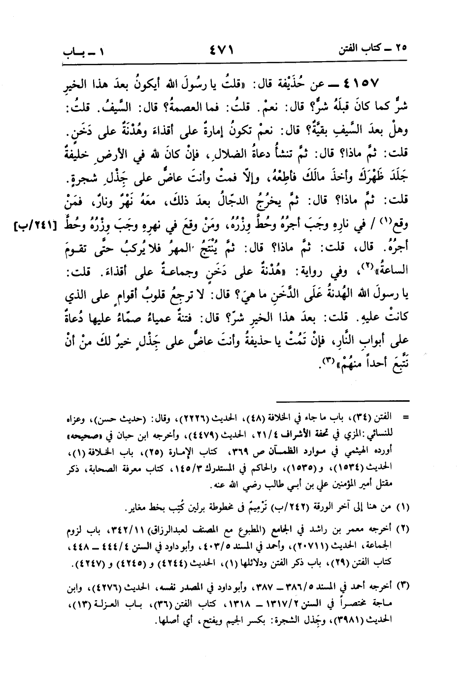 4157 - عن حُذَيْفة قال: "قلتُ يا رسُولَ اللَّه أيكونُ بعدَ هذا الخيرِ شرٌّ كما كانَ قبلَهُ شرٌّ؟ قال: نَعَمْ. قلتُ: فما العصمةُ؟ قال: السَّيفُ. قلتُ: وهلْ بعدَ السَّيفِ بقيَّةٌ؟ قال: نَعَمْ تكونُ إمارةٌ على أقذاءَ وهُدْنَةٌ على دَخَنٍ. قلت: ثمَّ ماذا؟ قال: ثمَّ تنشأُ دعاةُ الضلالِ، فإنْ كانَ للَّه في الأرضِ خليفةٌ جَلَدَ ظَهْرَكَ وأخذَ مالَكَ فأطِعْهُ، وإلّا فمتْ وأنتَ عاضٌّ على جَذْلِ شجرةٍ. قلت: ثمَّ ماذا؟ قال: ثم يخرُجُ الدجّالُ بعدَ ذلكَ، معَهُ نَهْرٌ ونارٌ، فمَنْ وقع (¬1) في نارِهِ وجَبَ أجرُهُ وحُطَّ وِزْرُهُ، ومَنْ وقعَ في نهرِهِ وجَبَ وِزْرُهُ وحُطَّ أجرُهُ. قال، قلت: ثمَّ ماذا؟ قال: ثمَّ يُنْتَجُ المهرُ فلا يُركبُ حتَّى تقومَ الساعةُ" (¬2)، وفي رواية: "هُدْنةٌ على دَخَنٍ وجماعةٌ على أقذاءَ. قلت: يا رسولَ اللَّه الهُدنةُ عَلَى الدَّخَنِ ما هيَ؟ قال: لا ترجِعُ قلوبُ أقوامٍ على الذي كانتْ عليهِ. قلت: بعدَ هذا الخيرِ شرّ؟ قال: فتنةٌ عمياءُ صمّاءُ عليها دُعاةٌ على أبوابِ النَّارِ، فإنْ تَمُتْ يا حذيفةُ وأنتَ عاضٌّ على جَذْلٍ خيرٌ لكَ منْ أنْ تَتَّبِعَ أحدًا منهُمْ" (¬3).