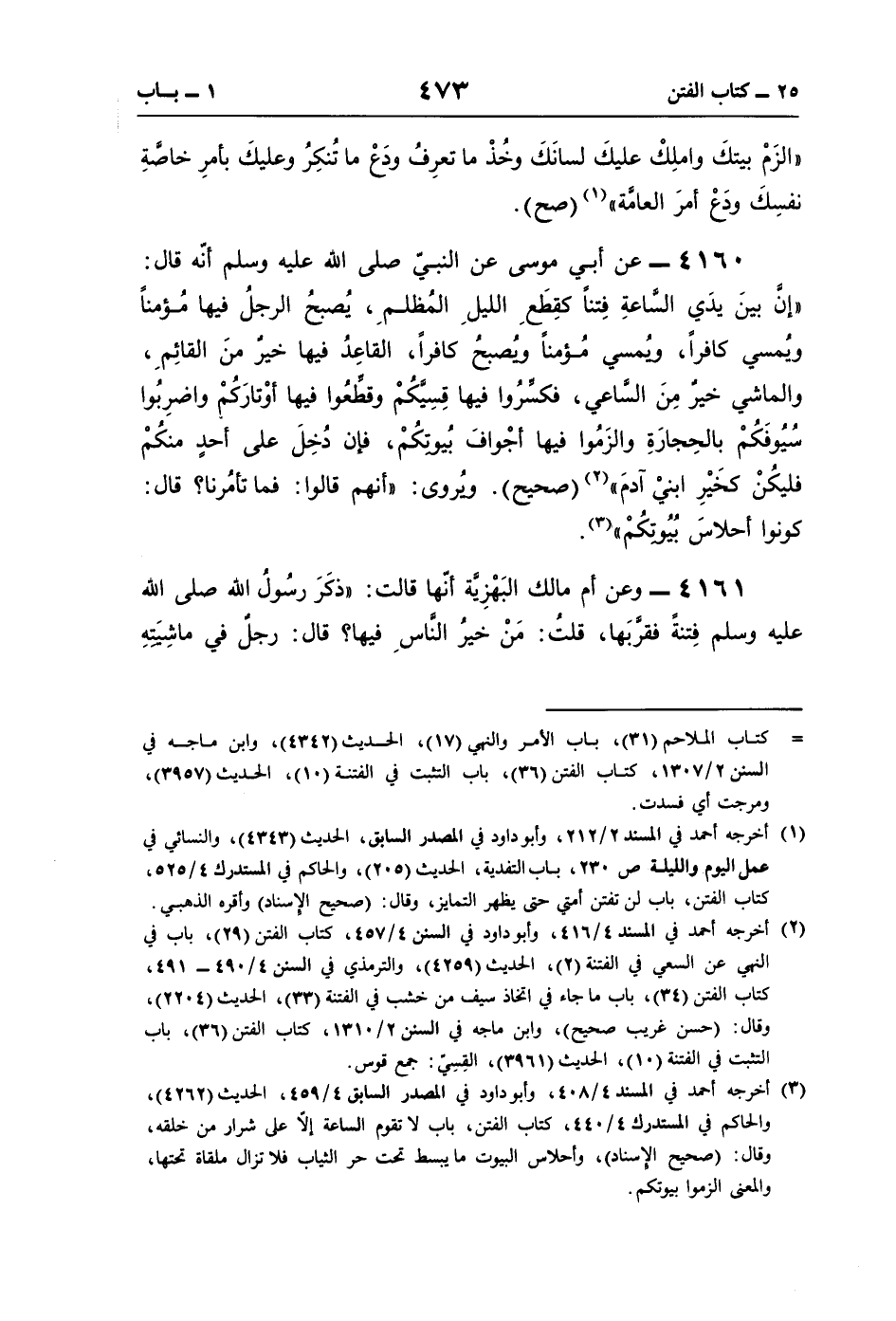 4160 - عن أبي موسى عن النَّبيّ صلى اللَّه عليه وسلم أنّه قال: "إنَّ بينَ يدَي السَّاعةِ فِتنًا كقِطَعِ الليلِ المُظلمِ، يُصبحُ الرجلُ فيها مُؤمنًا ويُمسي كافرًا، ويُمسي مُؤمنًا ويُصبحُ كافرًا، القاعِدُ فيها خيرٌ منَ القائِمِ، والماشي خيرٌ مِنَ السَّاعي، فكسِّرُوا فيها قِسِيَّكُمْ وقطِّعُوا فيها أوْتارَكُمْ واضرِبُوا سُيُوفَكُمْ بالحِجارَةِ والزَمُوا فيها أجْوافَ بُيوتِكُمْ، فإن دُخِلَ على أحدٍ منكمْ فليكُنْ كخَيْرِ ابنيْ آدمَ" (¬2) (صحيح). ويُروى: "أنَّهم قالوا: فما تأمُرنا؟ قال: كونوا أحلاسَ بُيُوتِكُمْ" (¬3).