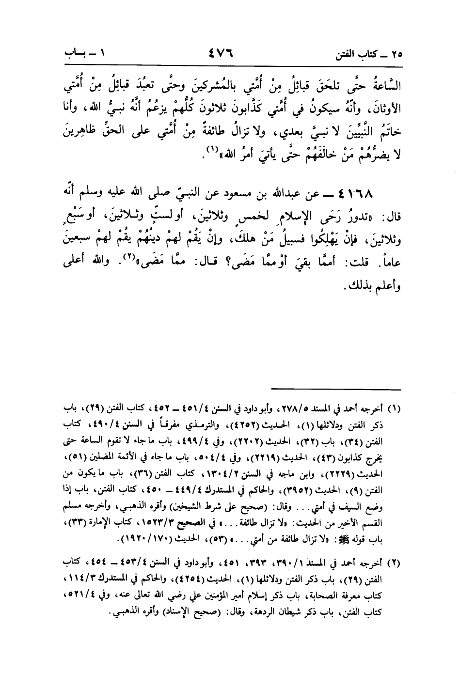 (¬1) أخرجه أحمد في المسند 5/ 278، وأبو داود في السنن 4/ 451 - 452، كتاب الفتن (29)، باب ذكر الفتن ودلائلها (1)، الحديث (4252)، والترمذي مفرقًا في السنن 4/ 490، كتاب الفتن (34)، باب (32)، الحديث (2202)، وفي 4/ 499، باب ما جاء لا تقوم الساعة حتَّى يخرج كذابون (43)، الحديث (2219)، وفي 4/ 504، باب ما جاء في الأئمة المضلين (51)، الحديث (2229)، وابن ماجه في السنن 2/ 1304، كتاب الفتن (36)، باب ما يكون من الفتن (9)، الحديث (3952)، والحاكم في المستدرك 4/ 449 - 450، كتاب الفتن، باب إذا وضع السيف في أمتي. . . وقال: (صحيح على شرط الشيخين) وأقره الذهبي، وأخرجه مسلم القسم الأخير من الحديث: "لا تزال طائفة. . . " في الصحيح 3/ 1523، كتاب الإمارة (33)، باب قوله -صلى اللَّه عليه وسلم-: "لا تزال طائفة من أمتي. . . " (53)، الحديث (170/ 1920).