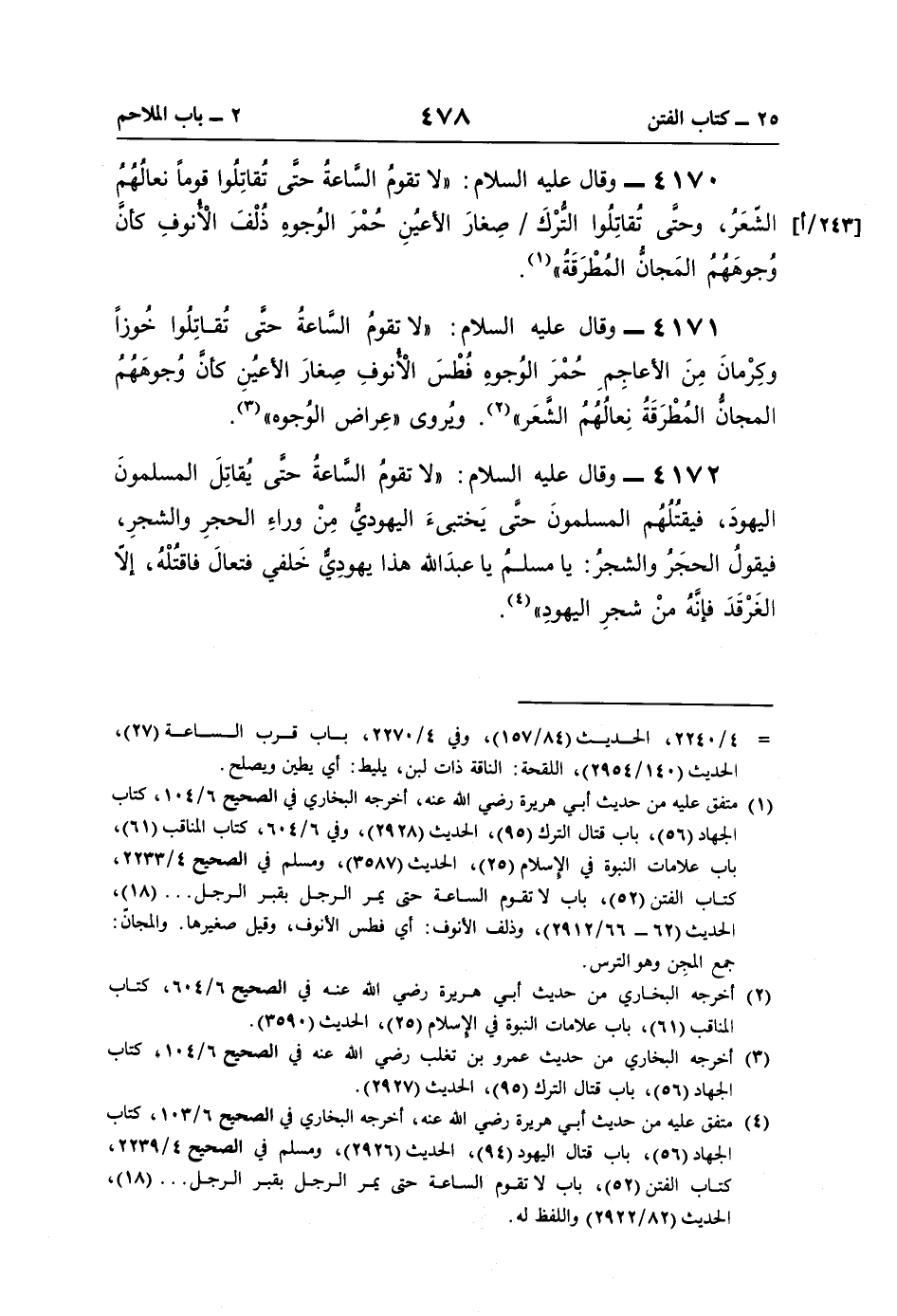 (¬1) متفق عليه من حديث أبي هريرة رضي اللَّه عنه، أخرجه البخاري في الصحيح 6/ 104، كتاب الجهاد (56)، باب قتال الترك (95)، الحديث (2928)، وفي 6/ 604، كتاب المناقب (61)، باب علامات النبوة في الإسلام (25)، الحديث (3587)، ومسلم في الصحيح 4/ 2233، كتاب الفتن (52)، باب لا تقوم الساعة حتَّى يمر الرجل بقبر الرجل. . . (18)، الحديث (62 - 66/ 2912)، وذلف الأنوف: أي فطس الأنوف، وقيل صغيرها. والمجانّ: جمع المجِن وهو الترس.