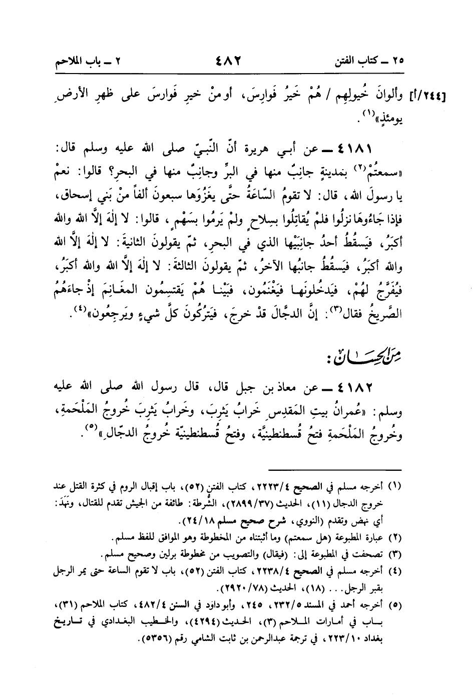4181 - عن أَبى هريرة أنّ النّبيّ صلى اللَّه عليه وسلم قال: "سمعتُمْ (¬2) بمدينةٍ جانِبٌ منها في البرِّ وجانِبٌ منها في البحرِ؟ قالوا: نعمْ يا رسولَ اللَّه، قال: لا تقومُ السّاعَةُ حتَّى يغَزُوَها سبعونَ ألفًا منْ بَني إسحاق، فإذا جَاءُوهَا نزلُوا فلمْ يُقاتِلُوا بسِلاحٍ ولمْ يَرمُوا بسَهْمٍ، قالوا: لا إلهَ إلَّا اللَّه واللَّه أكبَرُ، فيَسقُطُ أحدُ جانِبَيْها الذي في البحرِ، ثمَّ يقولونَ الثانيةَ: لا إلهَ إلَّا اللَّه واللَّه أكبَرُ، فيَسقُطُ جانبُها الآخرُ، ثمَّ يقولونَ الثالثةَ: لا إلهَ إلَّا اللَّه واللَّه أكبَرُ، فيُفَرَّجُ لَهُمْ، فيَدخُلونَها فيَغْنَمُون، فبَيْنا هُمْ يَقتسِمُون المغَانِمَ إذْ جاءَهُمُ الصَّريخُ فقال (¬3): إنَّ الدجَّالَ قدْ خرجَ، فيَترُكُونَ كلَّ شيءٍ ويَرجِعُون" (¬4).