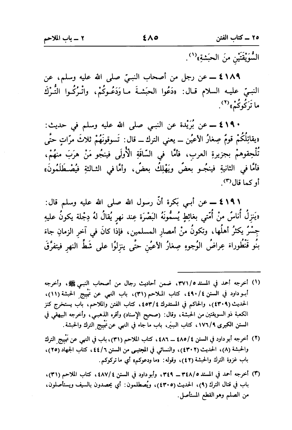 (¬2) أخرجه أبو داود في السنن 4/ 485 - 486، كتاب الملاحم (31)، باب في النهي عن تَهْيِيجِ الترك والحبشة (8)، الحديث (4302)، والنسائي في المجتبى من السنن 6/ 44، كتاب الجهاد (25)، باب غزوة الترك والحبشة (42)، وقوله: "ما ودعوكم" أي ما تركوكم.