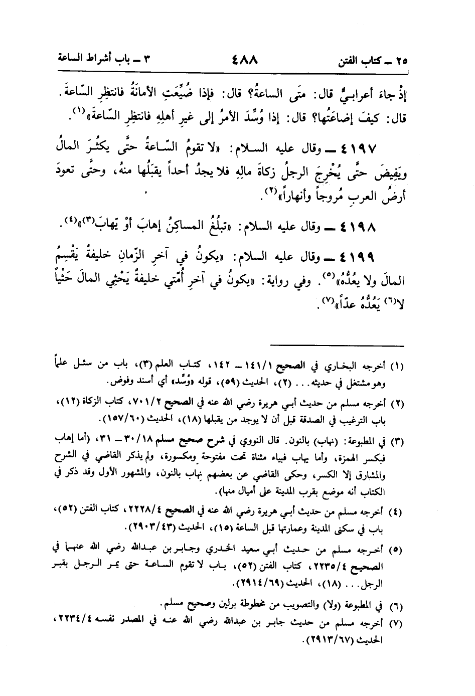 4199 - وقال عليه السلام: "يكونُ في آخرِ الزّمانِ خليفةٌ يَقْسِمُ المالَ ولا يعُدُّهُ" (¬5). وفي رواية: "يكونُ في آخرِ أُمّتي خليفةٌ يَحْثِي المالَ حَثْيًا لا (¬6) يَعُدُّهُ عدًّا" (¬7).