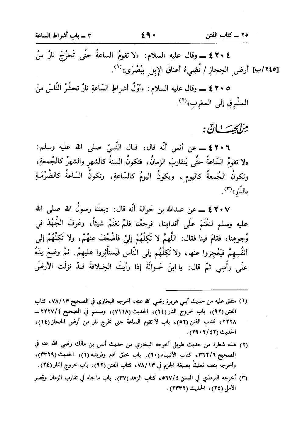 4204 - وقال عليه السلام: "لا تقومُ الساعةُ حتَّى تَخرُجَ نارٌ منْ أرضِ الحِجازِ تُضِيءُ أعناقَ الإبِلِ ببُصْرَى" (¬1).