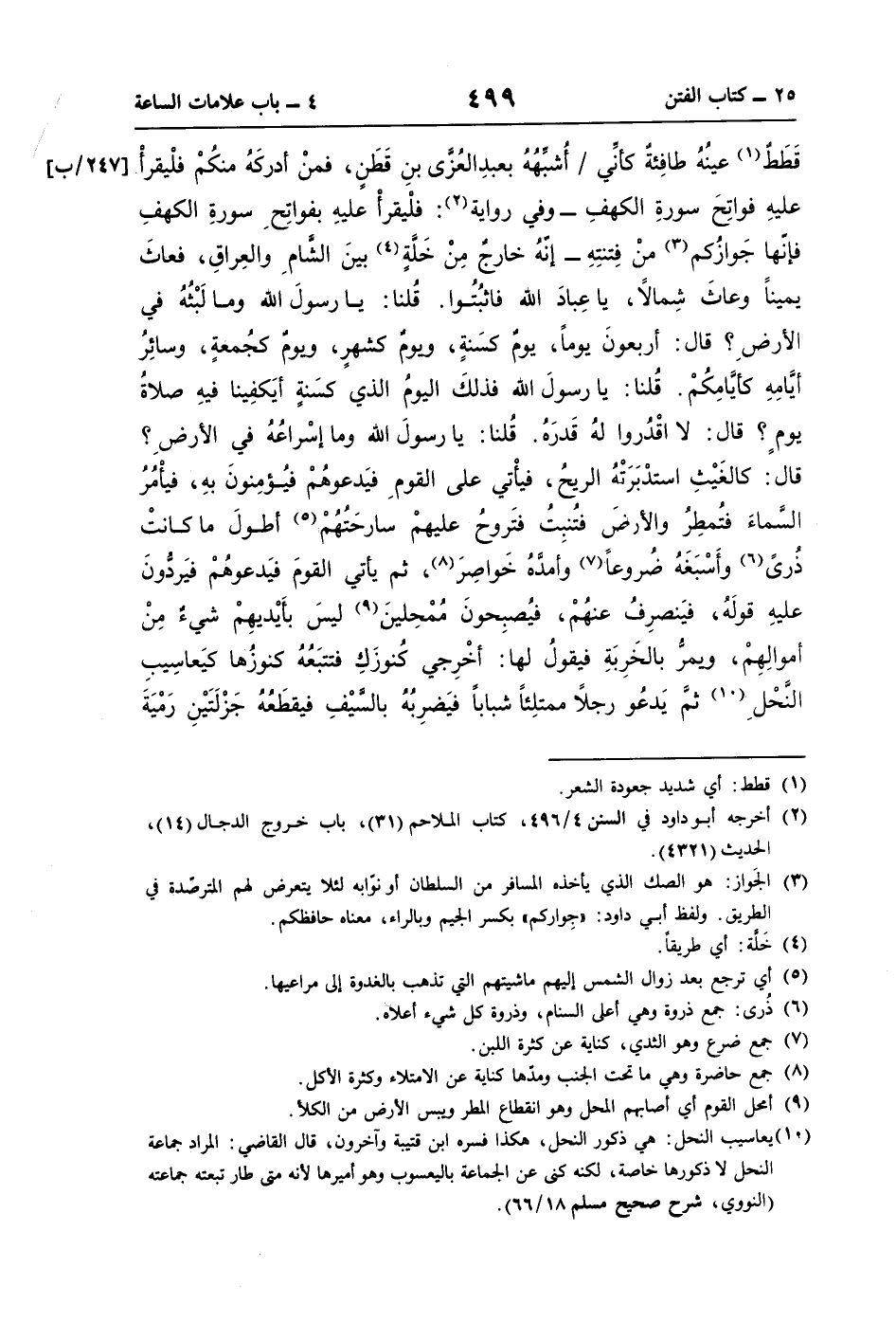 قَطَطٌ (¬1) عينُهُ طافِئةٌ كأنِّي أُشبِّهُهُ بعبدِ العُزَّى بنِ قَطَنٍ، فمنْ أدركَهُ منكُمْ فلْيقرأْ عليهِ فواتِحَ سورةِ الكهفِ -وفي رواية (¬2): فلْيقرأْ عليهِ بفواتِحِ سورةِ الكهفِ فإنّها جَوازُكم (¬3) منْ فِتنتِهِ- إنّهُ خارجٌ مِنْ خَلَّةٍ (¬4) بينَ الشَّامِ والعِراقِ، فعاثَ يمينًا وعاثَ شِمالًا، يا عِبادَ اللَّه فاثبُتُوا. قُلنا: يا رسولَ اللَّه وما لَبْثهُ في الأرضِ؟ قال: أربعونَ يومًا، يومٌ كسَنةٍ، ويومٌ كشهرٍ، ويومٌ كجُمعةٍ، وسائِرُ أيَّامِهِ كأيَّامِكُمْ. قُلنا: يا رسولَ اللَّه فذلكَ اليومُ الذي كسَنةٍ أيَكفِينا فيهِ صلاةُ يومٍ؟ قال: لا اقْدُروا لهُ قَدرَهُ. قلنا: يا رسولَ اللَّه وما إسْراعُهُ في الأرضِ؟ قال: كالغَيْثِ استدْبَرَتْهُ الريحُ، فيأْتي على القومِ فيَدعوهُمْ فيُؤمِنونَ بهِ، فيأْمُرُ السَّماءَ فتُمطِرُ والأرضَ فتُنبِتُ فتَروحُ عليهمْ سارحَتُهُمْ (¬5) أطولَ ما كانتْ ذُرًى (¬6) وأَسْبَغَهُ ضُروعًا (¬7) وأمدَّة خَواصِرَ (¬8)، ثمَّ يأتي القومَ فيَدعوهُمْ فيَردُّونَ عليهِ قولَهُ، فيَنصرِفُ عنهُمْ، فيُصبِحونَ مُمْحِلينَ (¬9) ليسَ بأَيْديهِمْ شيءٌ مِنْ أموالِهِمْ، ويمرُّ بالخَرِبَةِ فيقولُ لها: أخْرِجي كُنوزَكِ فتتبَعُهُ كنوزُها كيَعاسِيبِ النَّحْلِ (¬10) ثمَّ يَدعُو رجلًا ممتلِئًا شبابًا فيَضرِبُهُ بالسَّيْفِ فيقطَعُهُ جَزْلَتَيْنِ رَمْيَةَ