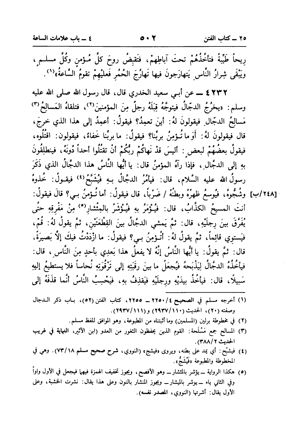4232 - عن أبي سعيد الخدري قال، قال رسول اللَّه صلى اللَّه عليه وسلم: "يخرُجُ الدجّالُ فيتوجَّهُ قِبَلَهُ رجلٌ مِنَ المؤمنينَ (¬2)، فتلقاهُ المَسالِحُ (¬3) مَسالِحُ الدجّالِ فيقولونَ لهُ: أينَ تعمِدُ؟ فيقولُ: أعمِدُ إلى هذا الذي خرجَ، قال فيقولونَ لهُ: أَوَ ما تُؤمِنُ بربِّنا؟ فيقولُ: ما بربِّنا خَفاءٌ، فيقولون: اقتُلُوه، فيقولُ بعضُهُمْ لبعضٍ: أليسَ قدْ نَهاكُمْ ربُّكُمْ أنْ تقتُلُوا أحدًا دُونَهُ، فينطلِقُونَ بهِ إلى الدجَّالِ، فإذا رآهُ المؤمنُ قال: يا أيُّها النَّاسُ هذا الدجَّالُ الذي ذَكَرَ رسول اللَّه عليه السَّلام، قال: فيأمُرُ الدجَّالُ بهِ فيُشَبَّحُ (¬4) فيقولُ: خُذوهُ وشُجُّوهُ، فيُوسعُ ظهرُهُ وبطنُهُ ضَرْبًا، قال فيقولُ: أما تُؤمنُ بي؟ قالَ فيقولُ: أنتَ المسيحُ الكذَّابُ، قال: فيُؤْمَرُ بهِ فيُؤْشَرُ بالمِئْشارِ (¬5) مِنْ مَفْرِقِهِ حتَّى يُفَرَّقَ بينَ رِجلَيْهِ، قال: ثمَّ يَمشي الدجَّالُ بينَ القِطْعَتَيْنِ، ثمَّ يقولُ لهُ: قُمْ، فيَستوِي قائِمًا، ثمَّ يقولُ لهُ: أتُؤمِنُ بي؟ فيقولُ: ما ازْدَدْتُ فيكَ إلَّا بَصيرَةً، قال: ثمَّ يقولُ: يا أيُّها النَّاسُ إنَّهُ لا يفعلُ هذا بَعدِي بأحدٍ مِنَ النَّاسِ، قال: فيأخُذُهُ الدجَّالُ لِيَذْبَحهُ فيُجعَلُ ما بينَ رقَبَتِهِ إلى تَرْقُوَتهِ نُحاسًا فلا يستطيعُ إليهِ سَبيلًا، قال: فيأخُذُ بيدَيْهِ ورِجلَيْهِ فيَقذِفُ بهِ، فيَحْسِبُ النَّاسُ أنَّما قذَفَهُ إلى