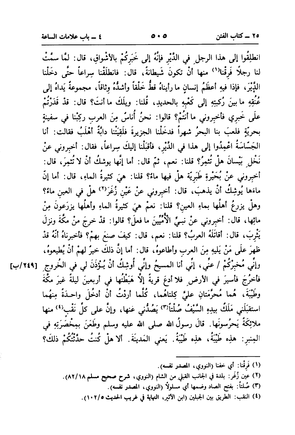 انطلِقُوا إلى هذا الرجلِ في الدَّيْرِ فإنَّهُ إلى خَبَرِكُمْ بالأشْواقِ، قال: لمَّا سمَّتْ لنا رجلًا فَرِقْنا (¬1) منها أنْ تكونَ شَيطانةً، قال: فانطلَقْنا سِراعًا حتَّى دخَلْنا الدَّيْرَ، فإذا فيهِ أعظَمُ إنسانٍ ما رأيناهُ قطُّ خَلْقًا وأشدُّهُ وِثاقًا، مجموعةٌ يَداهُ إلى عُنُقِهِ ما بينَ رُكبتِهِ إلى كَعْبِهِ بالحديدِ، قُلنا: ويلَكَ ما أنتَ؟ قال: قدْ قَدَرْتُمْ علَى خَبرِي فأخبِروني ما أنتُمْ؟ قالوا: نحنُ أُناسٌ مِنَ العربِ ركِبْنا في سفينةٍ بحريّةٍ فلعبَ بنا البحرُ شهرًا فدخَلْنا الجزيرةَ فلَقِيَتْنا دابًةٌ أهْلَبُ فقالت: أنا الجَسّاسَةُ اعْمِدُوا إلى هذا في الدَّيْرِ، فأقبَلْنا إليكَ سِراعًا، فقال: أخبِروني عنْ نَخْلِ بَيْسانَ هلْ تُثمِرُ؟ قلنا: نعم، ثمَّ قال: أما إنَّها يوشكُ أنْ لا تُثمِرَ، قال: أخبِروني عنْ بُحَيْرةِ طَبَرِيّة هلْ فيها ماءٌ؟ قلنا: هيَ كثيرةُ الماءِ، قال: أما إنّ ماءَها يُوشِكُ أنْ يذهبَ، قال: أخبِروني عنْ عَيْنِ زُغَرَ (¬2) هلْ في العينِ ماءٌ؟ وهلْ يزرعُ أهلُها بماءِ العينِ؟ قلنا: نَعَمْ هيَ كثيرةُ الماءِ وأهلُها يزرَعونَ مِنْ مائِها، قال: أخبِروني عنْ نبيِّ الْأُمِّيِّينَ ما فعلَ؟ قالوا: قدْ خرجَ منْ مكَّةَ ونزلَ يَثْرِبَ، قال: أقاتَلَهُ العربُ؟ قلنا: نعم، قال: كيفَ صنعَ بهمْ؟ فأخبرناهُ أنّهُ قدْ ظهرَ علَى مَنْ يَليهِ مِنَ العربِ وأطاعوهُ، قال: أما إنَّ ذلكَ خيرٌ لهمْ أنْ يُطيعوهُ، وإنِّي مُخبِرْكُمْ عنِّي، إنِّي أنا المسيحُ وإنِّي أُوشِكُ أنْ يُؤْذَنَ لي في الخُروج فأخرُجَ فأسيرَ في الأرضِ فلا أدعَ قريةً إلَّا هَبَطْتُها في أربعينَ ليلةً غيرَ مكَّةَ وطَيْبَةَ، هُما مُحرَّمَتانِ عليَّ كِلتاهُما، كُلَّما أردْتُ أنْ أدخُلَ واحدَةً مِنهُما استقبَلَني مَلَكٌ بيدِهِ السَّيْفُ صُلْتًا (¬3) يَصُدُّني عنها، وإنَّ على كلِّ نَقْبٍ (¬4) منها ملائِكَةً يَحرُسونَها. قالَ رسولُ اللَّه صلى اللَّه عليه وسلم وطَعَنَ بمِخْصَرَتِهِ في المِنبرِ: هذِه طَيْبَةُ، هذِه طَيْبَةُ. يَعني المَدينَة. ألا هلْ كُنتُ حدَّثْتُكُمْ ذلكَ؟