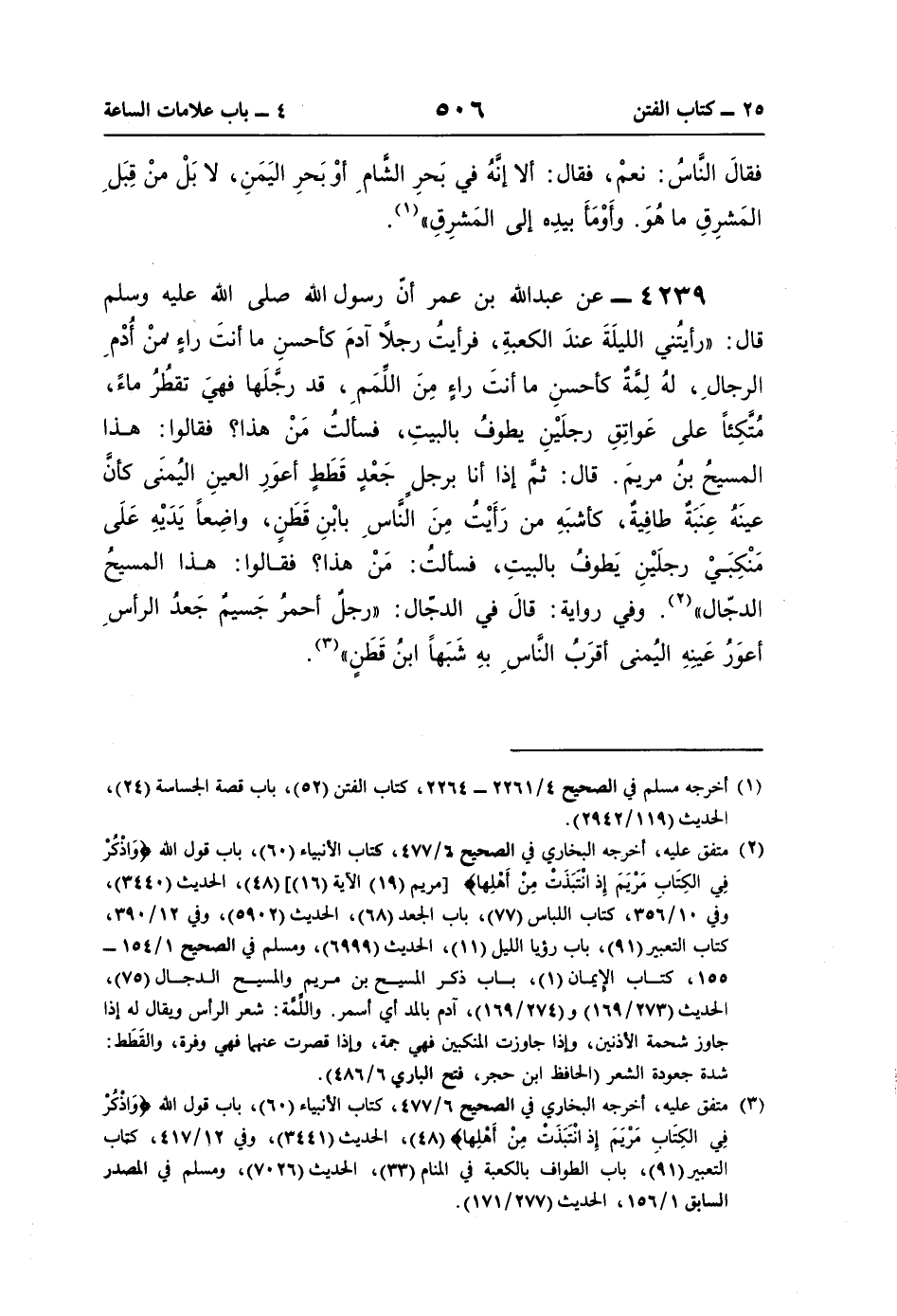 4239 - عن عبد اللَّه بن عمر أنّ رسول اللَّه صلى اللَّه عليه وسلم قال: "رأيتُني الليلَةَ عندَ الكعبةِ، فرأيتُ رجلًا آدمَ كأحسنِ ما أنتَ راءٍ منْ أُدْمِ الرجالِ، لهُ لِمَّةٌ كأحسنِ ما أنتَ راءٍ مِنَ اللِّمَمِ، قد رجَّلَها فهيَ تقطُرُ ماءً، مُتَّكِئًا على عَواتِقِ رجلَيْنِ يطوفُ بالبيتِ، فسألتُ مَنْ هذا؟ فقالوا: هذا المسيحُ بنُ مريمَ. قال: ثمَّ إذا أنا برجلٍ جَعْدٍ قَطَطٍ أعوَرِ العينِ اليُمنَى كأنَّ عينَهُ عِنَبَةٌ طافِيةٌ، كأشبَهِ من رَأَيْتُ مِنَ النَّاسِ بابْنِ قَطَنٍ، واضِعًا يَدَيْهِ عَلَى مَنْكِبَيْ رجلَيْنِ يَطوفُ بالبيتِ، فسألتُ: مَنْ هذا؟ فقالوا: هذا المسيحُ الدجّال" (¬2). وفي رواية: قالَ في الدجّال: "رجلٌ أحمرُ جَسيمٌ جَعدُ الرأسِ أعوَرُ عَينِهِ اليُمنى أقرَبُ النَّاسِ بهِ شَبَهًا ابنُ قَطَنٍ" (¬3).