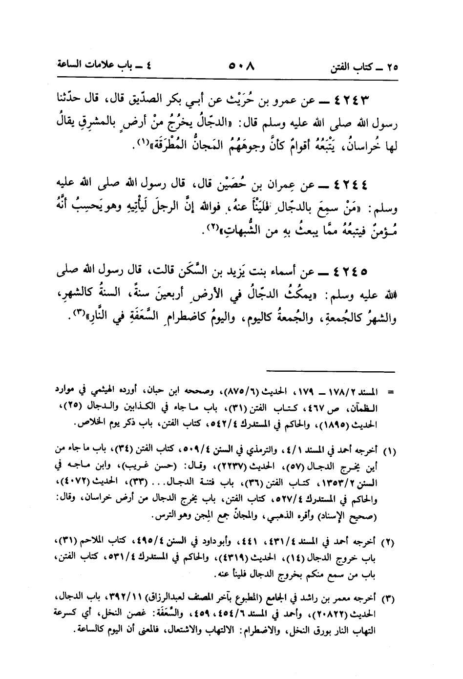 4245 - عن أسماء بنت يَزيد بن السَّكَن قالت، قال رسول اللَّه صلى اللَّه عليه وسلم: "يمكُثُ الدجّالُ في الأرضِ أربعينَ سنةً، السنةُ كالشهرِ، والشهرُ كالجُمعةِ، والجُمعةُ كاليوم، واليومُ كاضطرامِ السَّعَفَةِ في النَّارِ" (¬3).