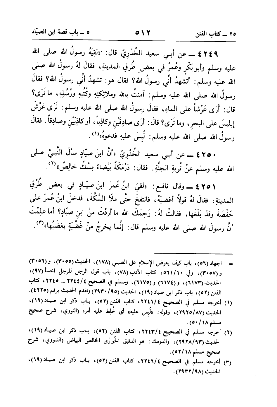 4249 - عن أبي سعيد الخُدْرِيّ قال: "لقِيَهُ رسولُ اللَّه صلى اللَّه عليه وسلم وأبو بَكْرٍ وعُمرُ في بعضِ طُرقِ المدينةِ، فقالَ لهُ رسول اللَّه صلى اللَّه عليه وسلم: أتشهدُ أنِّي رسولُ اللَّه؟ فقال هو: تشهدُ أنِّي رسولُ اللَّه؟ فقالَ رسولُ اللَّه صلى اللَّه عليه وسلم: آمنتُ باللَّه وملائِكتِهِ وكُتُبهِ ورُسُلِهِ، ما تَرَى؟ قال: أَرَى عَرْشًا على الماءِ، فقالَ رسولُ اللَّه صلى اللَّه عليه وسلم: نَرَى عَرْشَ إبليسَ على البحرِ، وما تَرَى؟ قالَ: أرَى صادِقَيْنِ وكاذِبًا، أو كاذِبَيْنِ وصادِقًا. فقالَ رسولُ اللَّه صلى اللَّه عليه وسلم: لُبِسَ عليهِ فدعوهُ" (¬1).