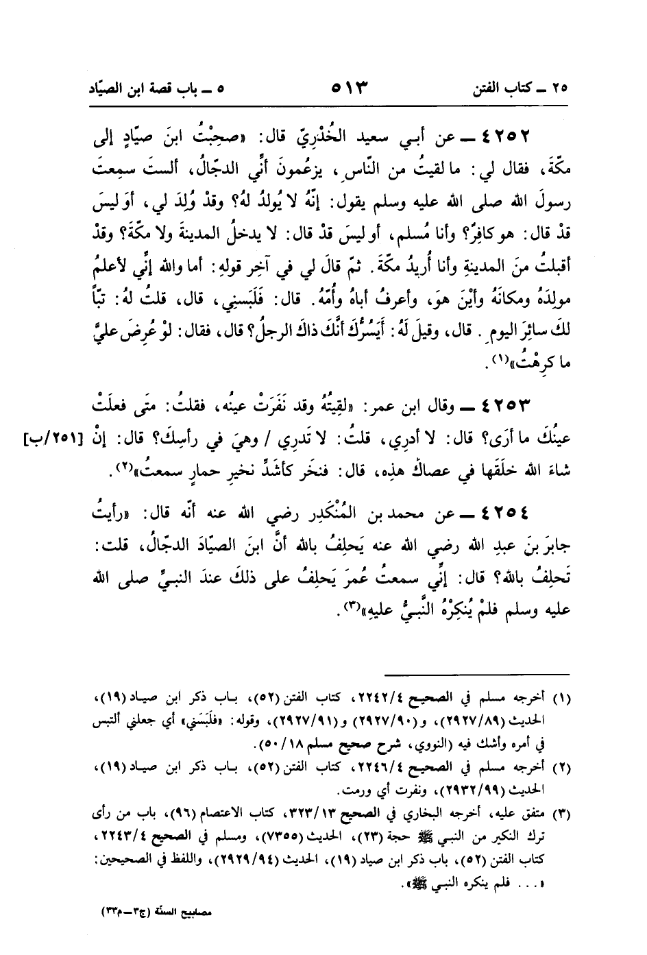 (¬1) أخرجه مسلم في الصحيح 4/ 2242، كتاب الفتن (52)، باب ذكر ابن صياد (19)، الحديث (89/ 2927)، و (90/ 2927) و (91/ 2927)، وقوله: "فلَبَسَني" أي جعلني ألتبس في أمره وأشك فيه (النووي، شرح صحيح مسلم 18/ 50).