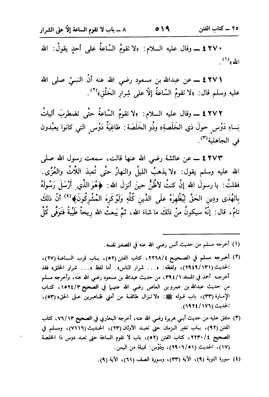 4271 - عن عبد اللَّه بن مسعود رضي اللَّه عنه أنّ النَّبيّ صلى اللَّه عليه وسلم قال: "لا تقومُ السّاعةُ إلّا على شِرارِ الخَلْقِ" (¬2).