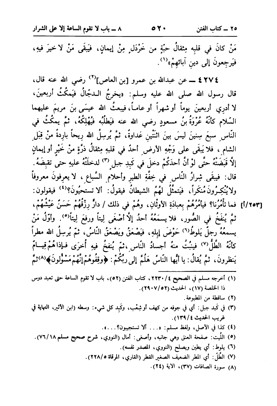 4274 - عن عبد اللَّه بن عمرو [بن العاص] (¬2) رضي اللَّه عنه قال، قال رسول اللَّه صلى اللَّه عليه وسلم: "يخرجُ الدّجالُ فيَمكُثُ أربعينَ، لا أدرِي أربعينَ يومًا أو شهرًا أو عامًا، فيبعثُ اللَّه عيسَى بنَ مريمَ عليهما السلام كأنّهُ عُرْوَةُ بنُ مسعودٍ رضي اللَّه عنه فيَطلُبُه فيُهْلِكُهُ، ثمَّ يمكُثُ في الناسِ سبعَ سِنينَ ليسَ بينَ اثنَتْينِ عَداوة، ثمَّ يُرسِلُ اللَّه رِيحًا بارِدةً منْ قِبَل الشامِ، فلا يَبقَى على وَجْهِ الأرضِ أحد في قلبهِ مِثقالُ ذرَّةٍ منْ خَيْرٍ أو إيمانٍ إلَّا قَبَضتْهُ حتَّى لوْ أنَّ أحدَكُمْ دخلَ في كَبِدِ جبل (¬3) لدخلَتْهُ عليهِ حتَّى تقبِضَهُ. قال: فيبقَى شِرارُ النّاسِ في خِفَّةِ الطيرِ وأحلامِ السِّباعِ، لا يعرِفونَ معروفًا ولا يُنْكِرُونَ مُنكَرًا، فيَتمثلُ لهُمُ الشيطانُ فيقولُ: ألا تستحيُونَ؟ (¬4) فيقولون: فما تأْمُرُنا؟ فيأمُرُهُمْ بِعبادَةِ الأوثْانِ، وهُمْ في ذلك دارٌّ رِزْقُهُمْ حَسَنٌ عَيْشُهُمْ، ثمَّ ينفَخُ في الصور، فلا يسمَعُهُ أحدُ إلَّا أصْغَى لِيتًا ورفعَ لِيتًا (¬5). وأوّلُ مَنْ يسمعُهُ رجلٌ يَلوطُ (¬6) حَوْضَ إبلهِ، فيَصْعَقُ ويَصْعَقُ النَّاسُ، ثمَّ يُرسِلُ اللَّه مطرًا كأنّهُ الطَّلُّ (¬7) فينبُتُ منهُ أجسادُ الناسِ، ثمّ يُنفخُ فيهِ أُخرَى فإذا هُمْ قِيامٌ يَنظرونَ، ثمَّ يُقالُ: يا أيُّها النّاسُ هَلُمَّ إلى ربِّكُمْ: {وَقِفُوهُمْ إِنَّهُمْ مَسْئُولُونَ} (¬8) ثمَّ