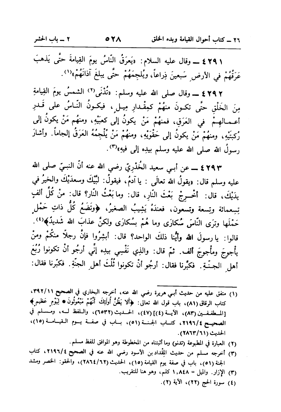 (¬3) أخرجه مسلم من حديث المِقْداد بن الأسود رضي اللَّه عنه في الصحيح 4/ 2196، كتاب الجنة (51)، باب في صفة يوم القيامة (15)، الحديث (62/ 2864)، والحقو: الخصر ومشد الإزار. والميل= 1.848 كلم، وهو هنا للتقريب.