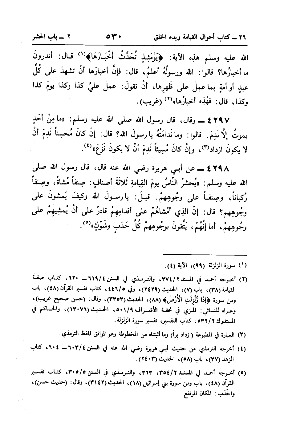 (¬2) أخرجه أحمد في المسند 2/ 374، والترمذي في السنن 4/ 619 - 620، كتاب صفة القيامة (38)، باب (7)، الحديث (2429)، وفي 5/ 446، كتاب تفسير القرآن (48)، باب ومن سورة {إِذَا زُلْزِلَتِ الأرْضِ} (88)، الحديث (3353)، وقال: (حسن صحيح غريب)، وعزاه للنسائي: المزي في تحفة الأشراف 9/ 501، الحديث (13076)، والحاكم في المستدرك 2/ 532، كتاب التفسير، تفسير سورة الزلزلة.
