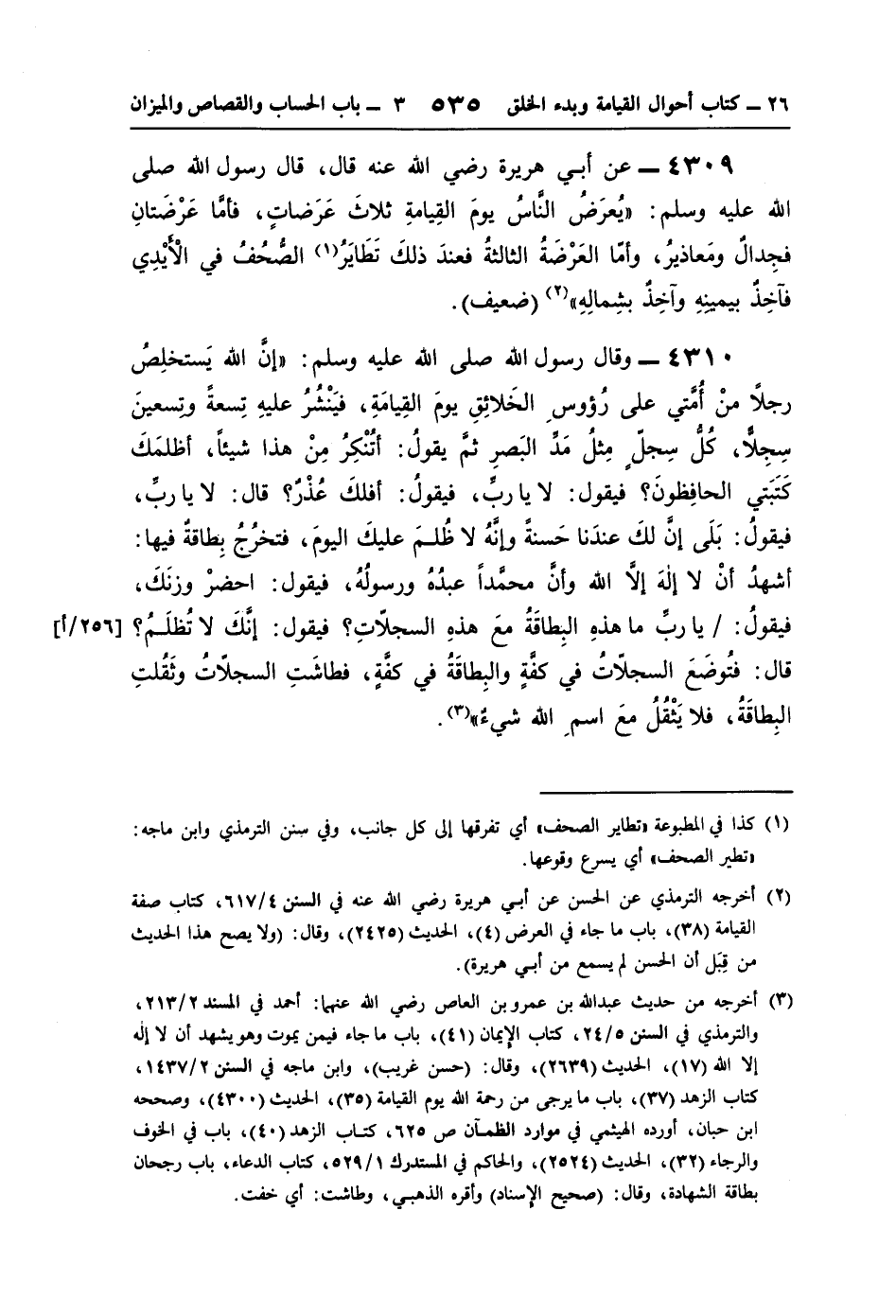 4310 - وقال رسول اللَّه صلى اللَّه عليه وسلم: "إنَّ اللَّه يَستخلِصُ رجلًا منْ أُمَّتي على رُؤوسِ الخَلائِقِ يومَ القِيامَةِ، فيَنْشُرُ عليهِ تِسعةً وتسعينَ سِجِلًا، كُلُّ سِجل مِثلُ مَدِّ البَصرِ ثمَّ يقولُ: أتُنْكِرُ مِنْ هذا شيئًا، أظلمَكَ كَتَبَتي الحافِظونَ؟ فيقول: لا يا ربِّ، فيقولُ: أفلكَ عُذْرٌ؟ قال: لا يا ربِّ، فيقولُ: بَلَى إنَّ لكَ عندَنا حَسنةً وإنَّهُ لا ظُلمَ عليكَ اليومَ، فتخرُجُ بِطاقةٌ فيها: أشهدُ أنْ لا إلهَ إلّا اللَّه وأن محمدًا عبدُهُ ورسولُهُ، فيقول: احضرْ وزنَكَ، فيقولُ: يارب ما هذهِ البطاقَةُ معَ هذهِ السجلّاتِ؟ فيقول: إنَّكَ لا تُظلَمُ؟ قال: فتُوضَعَ السجلّاتُ في كفةٍ والبِطاقَةُ في كفَّةٍ، فطاشَتِ السجلّاتُ وثَقُلتِ البِطاقَةُ، فلا يَثْقُلُ معَ اسمِ اللَّه شيءٌ" (¬3).