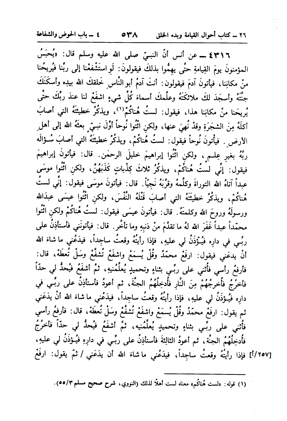 4316 - عن أنس أنّ النبيّ صلى اللَّه عليه وسلم قال: "يُحبَسُ المؤمنونَ يومَ القِيامةِ حتَّى يهِمُّوا بذلكَ فيقولونَ: لَوِ استَشْفعْنا إلى ربِّنا فيُريحُنا منْ مكانِنا، فيأتونَ آدمَ فيقولون: أنتَ آدمُ أبو النَّاسِ خَلقكَ اللَّه بيدِه وأسكَنَكَ جنَّتَهُ وأسجَدَ لكَ ملائكَتَهُ وعلَّمكَ أسماءَ كُلِّ شيءٍ اشفَعْ لنا عندَ ربِّكَ حتَّى يُريحَنا منْ مكانِنا هذا، فيقول: لستُ هُناكُمْ (¬1)، ويذكُرُ خطيئتَهُ التي أصابَ أكلَهُ مِنَ الشجَرَةِ وقدْ نُهيَ عنها، ولكنِ ائْتُوا نُوحًا أوَّلَ نبيٍّ بعثَهُ اللَّه إلى أهلِ الأرضِ. فيأْتونَ نُوحًا فيقول: لستُ هُناكُمْ، ويذكُر خطيئتَهُ التي أصابَ سُؤالَه ربَّه بغيرِ عِلمٍ، ولكنِ ائْتُوا إبراهيمَ خليلَ الرحمن. قال: فيأتونَ إبراهيمَ فيقول: إنِّي لستُ هُناكُمْ، ويذكُرُ ثلاثَ كِذْباتٍ كَذَبَهُنَّ، ولكنِ ائْتُوا موسَى عبدًا آتاهُ اللَّه التوراةَ وكلَّمهُ وقرَّبَهُ نَجِيًّا. قال: فيأتونَ موسَى فيقول: إنِّي لستُ هُناكُمْ، ويذكُرُ خطيئَتَهُ التي أصابَ قَتْلَهُ النَّفْسَ، ولكنِ ائْتُوا عيسَى عبدَ اللَّه ورسولَهُ وروحَ اللَّه وكلمتَهُ. قال: فيأتونَ عيسَى فيقول: لستُ هُناكُمْ ولكنِ ائْتُوا محمّدًا عبدًا غَفَرَ اللَّه لهُ ما تقدَّمَ منْ ذنبِهِ وما تأخَّر. قال: فيأتونَني فأستأذِنُ على ربِّي في دارِه فيُؤذَنُ لي عليهِ، فإذا رأيتُهُ وقعتُ ساجِدًا، فيدَعُني ما شاءَ اللَّه أنْ يدعَني فيقول: ارفَعْ محمّدُ وقُلْ يسمَعْ واشفَعْ تُشفَّعْ وسَلْ تُعطَهْ، قال: فأرفعُ رأسي فأثني على ربِّي بثناءٍ وتحميدٍ يُعلِّمُنيهِ، ثمَّ أشفَعُ فيُحدُّ لي حدًّا فأخرُجُ فأُخرجُهُمْ مِنَ النَّارِ فأُدخِلُهُمُ الجنَّةَ، ثمَّ أعود فأستأذِنُ على ربِّي في دارِه فيُؤذَنُ لي عليهِ، فإذا رأيتُهُ وقعتُ ساجِدًا، فيدَعُني ما شاءَ اللَّه أنْ يدَعَني ثم يقول: ارفَعْ محمّدُ وقُلْ يُسمَعْ واشفَعْ تُشفَّعْ وسَلْ تُعطَهْ، قال: فأرفعُ رأسي فأُثني على ربِّي بثناءٍ وتحميدٍ يُعلِّمُنيه، ثمَّ أشفَعُ فيُحدُّ لي حدًّا فأخرُجُ فأُدخِلُهُمُ الجنَّة، ثمَّ أعودُ الثالِثةَ فأستأذِنُ على ربِّي في دارِهِ فيُؤذَنُ لي عليهِ، فإذا رأيتُهُ وقعت ساجِدًا، فيدَعُني ما شاءَ اللَّه أن يدَعَني ثمّ يقول: ارفَعْ