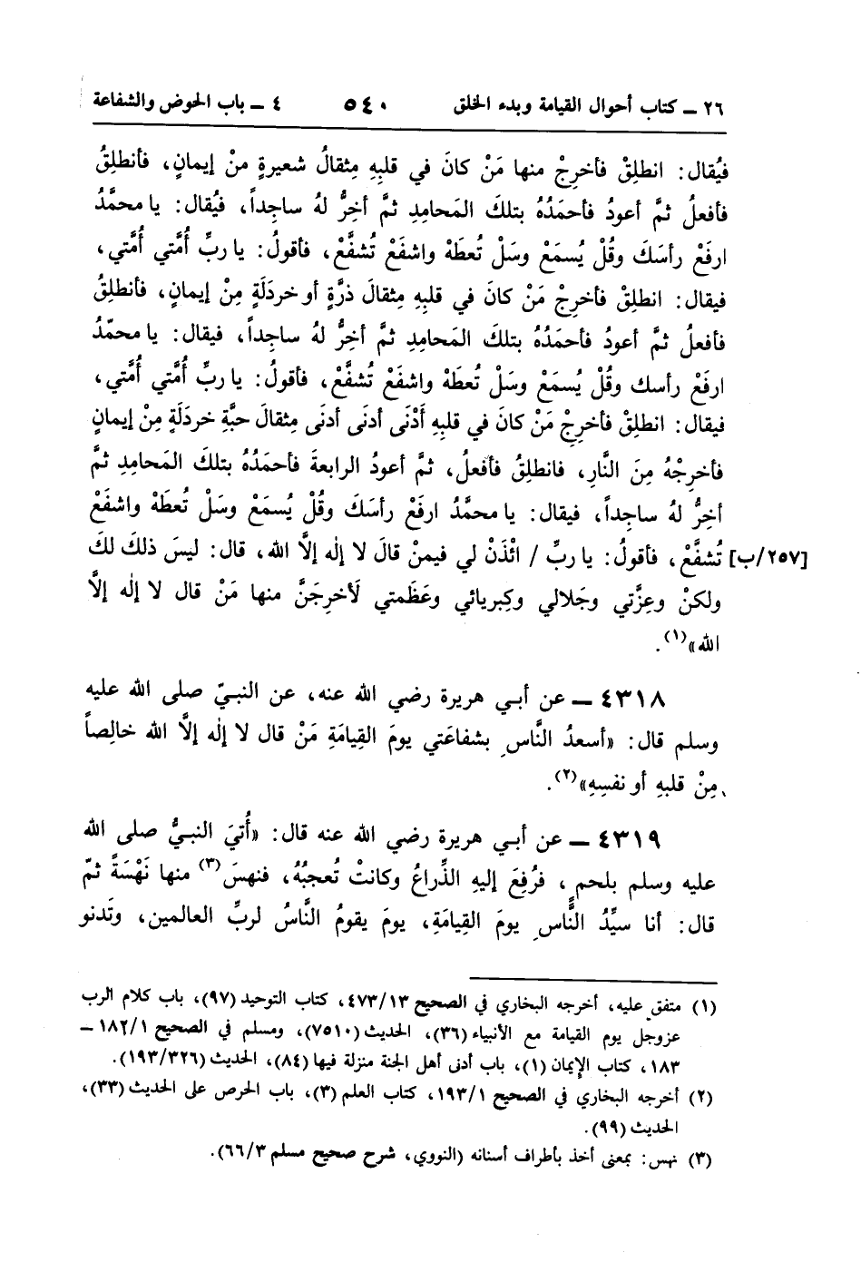 فيُقال: انطلِقْ فأخرِجْ منها مَنْ كانَ في قلبِهِ مِثقالُ شعيرةٍ منْ إيمانٍ، فأنطلِقُ فأفعلُ ثم أعودُ فأحمَدُهُ بتلكَ المَحامِدِ ثم أخِرُّ لهُ ساجِدًا، فيُقال: يا محمَّدُ ارفَعْ رأسَكَ وقُلْ يُسمَعْ وسَلْ تُعطَهْ واشفَعْ تُشفَّعْ، فأقولُ: يا ربِّ أُمَّتي أُمَّتي، فيقال: انطلِقْ فأخرِجْ مَنْ كانَ في قلبِهِ مِثقالَ ذرةٍ أو خردَلَةٍ مِنْ إيمانٍ، فأنطلِقُ فأفعلُ ثم أعودُ فأحمَدُهُ بتلكَ المَحامِدِ ثمَّ أخِرُّ لهُ ساجِدًا، فيقال: يا محمّدُ ارفَعْ رأسك وقُلْ يُسمَعْ وسَلْ تُعطَهْ واشفَعْ تُشفَّعْ، فأقولُ: يا ربِّ أُمَّتي أُمَّتي، فيقال: انطلِقْ فأخرِجْ مَنْ كانَ في قلبِهِ أَدْنَى أدنَى أدنَى مِثقالَ حبَّةِ خردَلَة مِنْ إيمانٍ فأخرِجْهُ مِنَ النَّارِ، فانطلِقُ فأفعلُ، ثمَّ أعودُ الرابعةَ فأحمَدُهُ بتلكَ المَحامِدِ ثمَّ أخِرُّ لهُ ساجِدًا، فيقال: يا محمَّدُ ارفَعْ رأسَكَ وقُلْ يُسمَعْ وسَلْ تُعطَهْ واشفَعْ تُشفَّعْ، فأقولُ: يا ربِّ ائْذَنْ لي فيمنْ قالَ لا إله إلَّا اللَّه، قال: ليسَ ذلكَ لكَ ولكنْ وعِزَّتي وجَلالي وكِبريائي وعَظَمتي لَأخرِجَنَّ منها مَنْ قال لا إله إلّا اللَّه" (¬1).