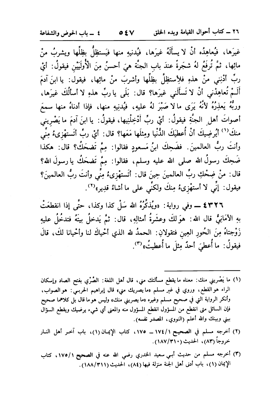 (¬3) أخرجه مسلم من حديث أبي سعيد الخدري رضي اللَّه عنه في الصحيح 1/ 175، كتاب الإيمان (1)، باب أدني أهل الجنة منزلة فيها (84)، الحديث (311/ 188).