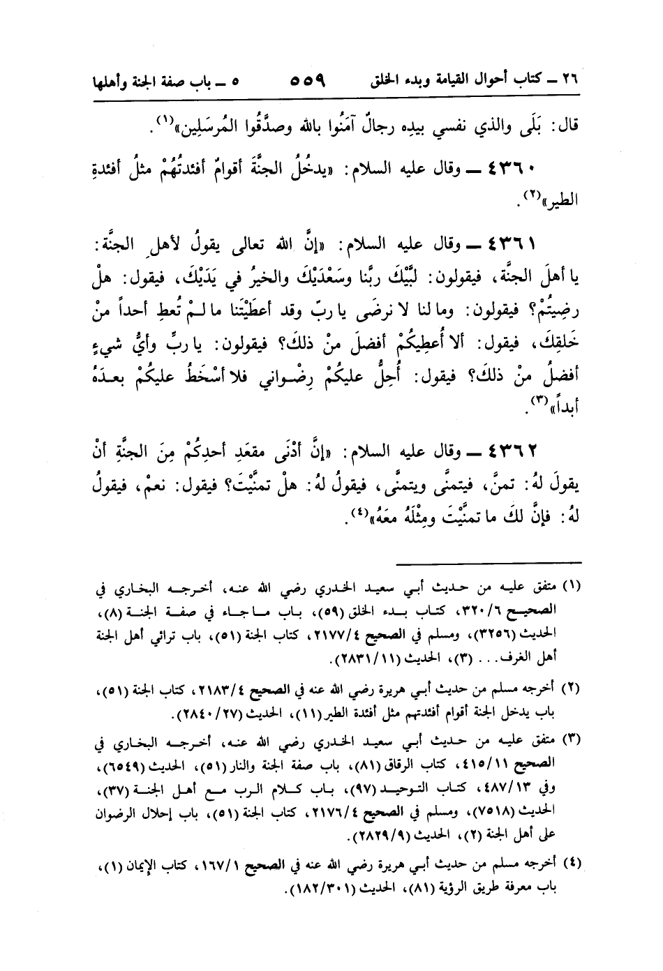 4361 - وقال عليه السلام: "إنَّ اللَّه تعالى يقولُ لأهلِ الجنَّة: يا أهلَ الجنَّة، فيقولون: لبَّيْكَ ربَّنا وسَعْدَيْكَ والخيرُ في يَدَيْكَ، فيقول: هلْ رضِيتُمْ؟ فيقولون: وما لنا لا نرضَى يا ربّ وقد أعطَيْتَنا ما لمْ تُعطِ أحدًا منْ خَلقِكَ، فيقول: ألا أُعطِيكُمْ أفضلَ منْ ذلكَ؟ فيقولون: يا ربِّ وأيُّ شيءٍ أفضلُ منْ ذلكَ؟ فيقول: أُحِلُّ عليكُمْ رِضْواني فلا أسْخَطُ عليكُمْ بعدَهُ أبدًا" (¬3).