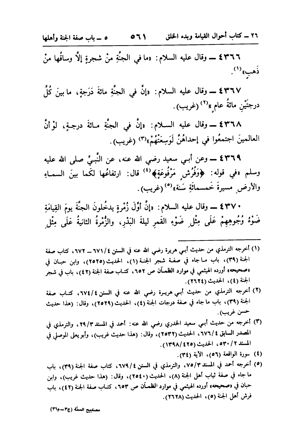 4367 - وقال عليه السلام: "إنَّ في الجنَّةِ مائةَ دَرَجةٍ، ما بينَ كُلِّ درجتَيْنِ مائةُ عامٍ" (¬2) (غريب).