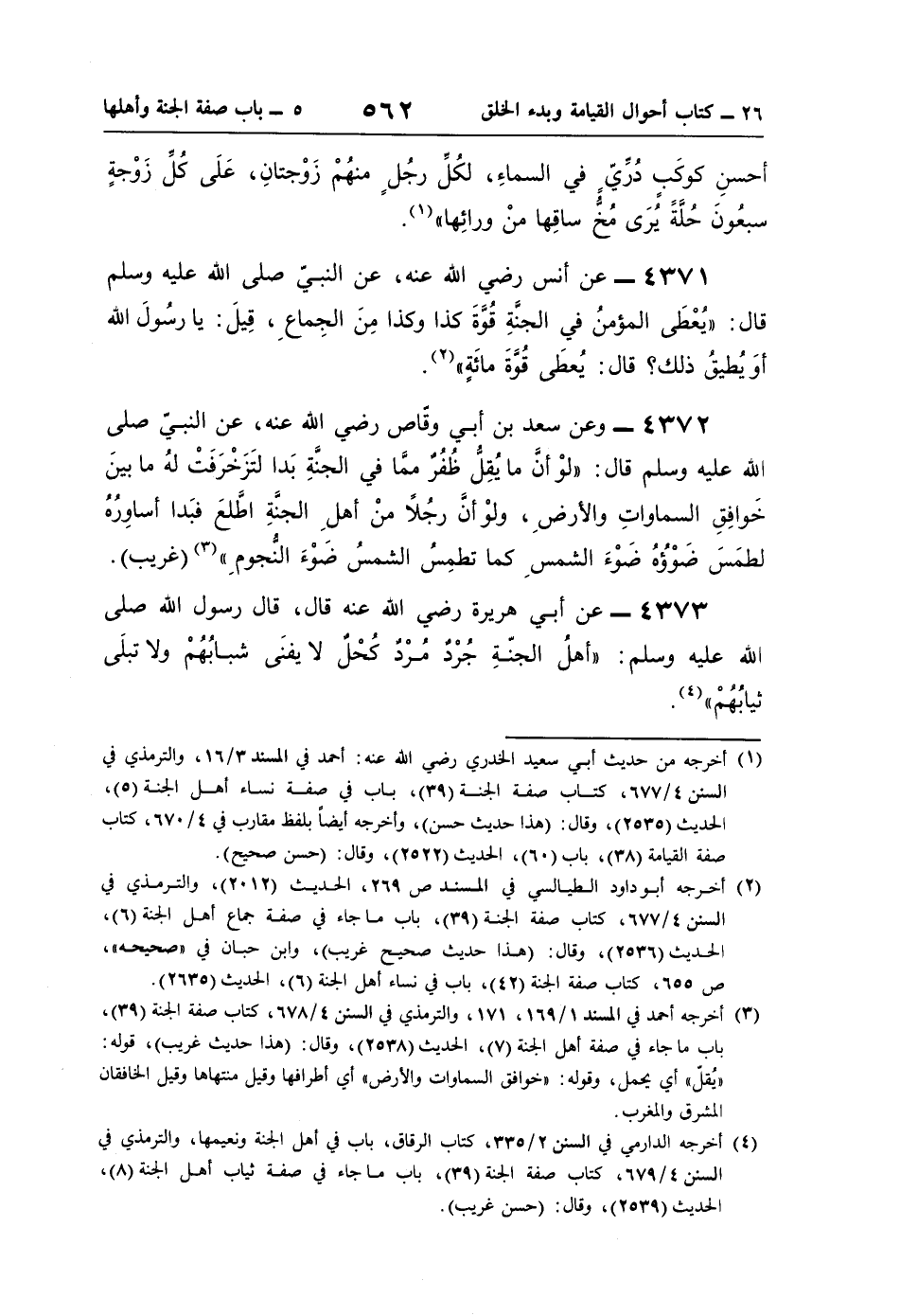 4373 - عن أبي هريرة رضي اللَّه عنه قال، قال رسول اللَّه صلى اللَّه عليه وسلم: "أهلُ الجنَّةِ جُرْدٌ مُرْدٌ كُحْلٌ لا يفنَى شبابُهُمْ ولا تبلَى ثيابُهُمْ" (¬4).