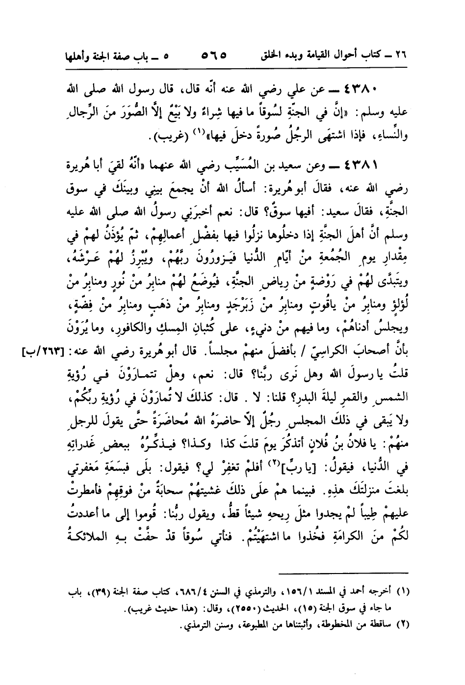 4380 - عن علي رضي اللَّه عنه أنّه قال، قال رسول اللَّه صلى اللَّه عليه وسلم: "إنَّ في الجنَّةِ لسُوقًا ما فيها شِراءٌ ولا بَيْعٌ إلّا الصُّوَرَ منَ الرِّجالِ والنِّساءِ، فإذا اشتهَى الرجُلُ صُورة دخلَ فيها" (¬1) (غريب).