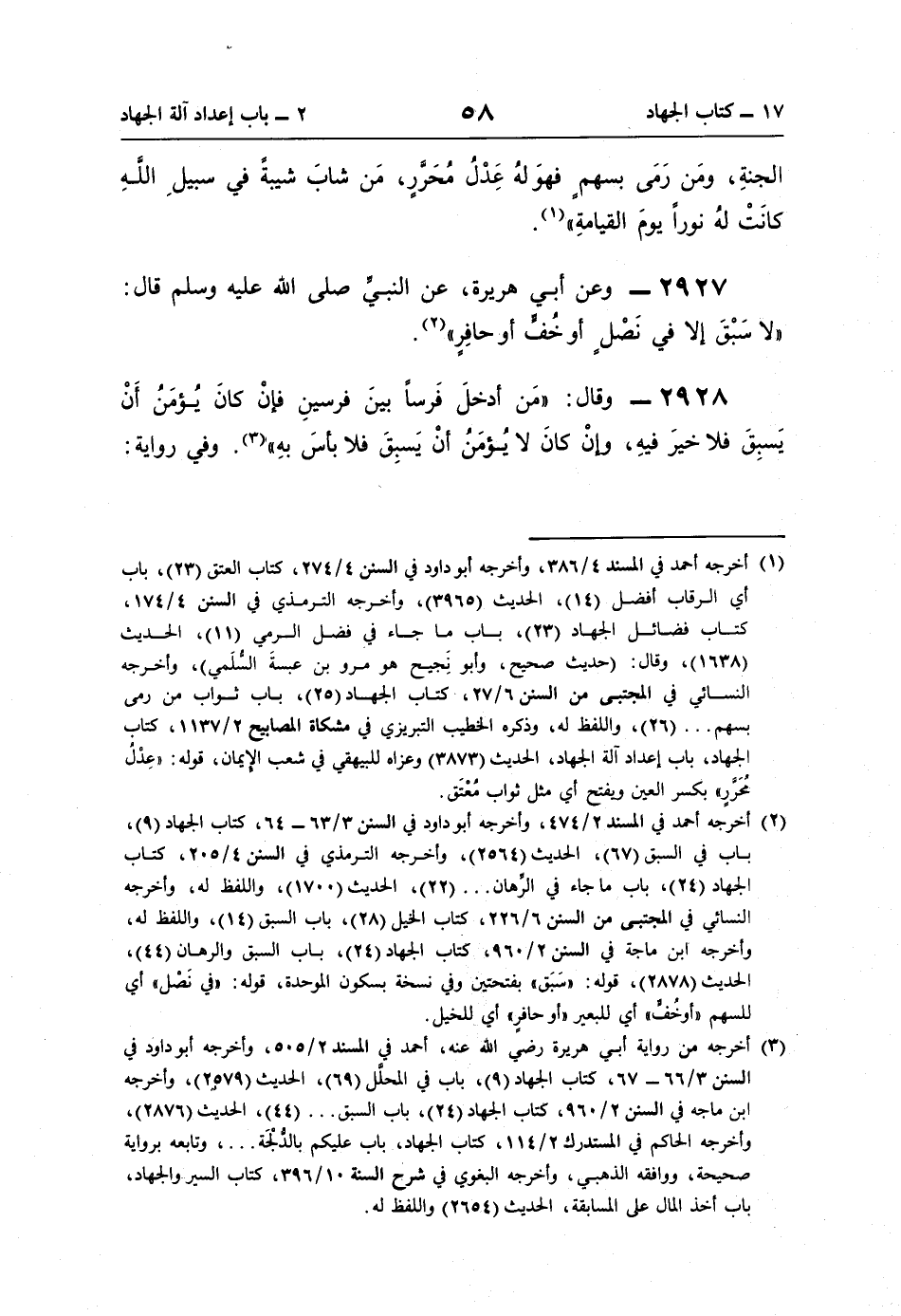 (¬2) أخرجه أحمد في المسند 2/ 474، وأخرجه أبو داود في السنن 3/ 63 - 64، كتاب الجهاد (9)، باب في السبق (67)، الحديث (2564)، وأخرجه الترمذي في السنن 4/ 205، كتاب الجهاد (24)، باب ما جاء في الرِّهان. . . (22)، الحديث (1700)، واللفظ له، وأخرجه النسائي في المجتبى من السنن 6/ 226، كتاب الخيل (28)، باب السبق (14)، واللفظ له، وأخرجه ابن ماجه في السنن 2/ 960، كتاب الجهاد (24)، باب السبق والرهان (44)، الحديث (2878)، قوله: "سَبَق" بفتحتين وفي نسخة بسكون الموحدة، قوله: "في نَصْل" أي للسهم "أو خُفٍّ" أي للبعير "أو حافرٍ" أي للخيل.
