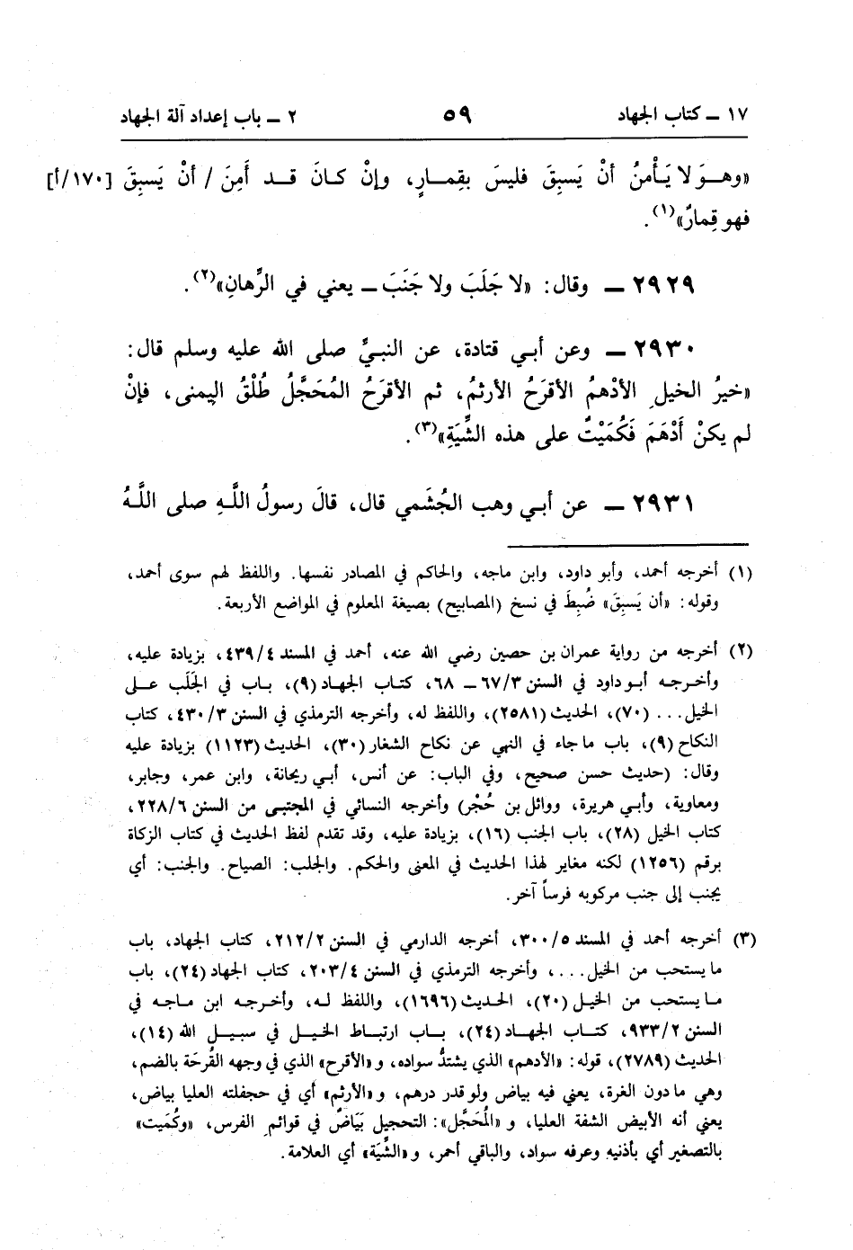 (¬2) أخرجه من رواية عمران بن حصين رضي اللَّه عنه، أحمد في المسند 4/ 439، بزيادة عليه، وأخرجه أبو داود في السنن 3/ 67 - 68، كتاب الجهاد (9)، باب في الجَلَب على الخيل. . . (70)، الحديث (2581)، واللفظ له، وأخرجه الترمذي في السنن 3/ 430، كتاب النكاح (9)، باب ما جاء في النهي عن نكاح الشغار (30)، الحديث (1123) بزيادة عليه وقال: (حديث حسن صحيح، وفي الباب: عن أنس، أبي ريحانة، وابن عمر، وجابر، ومعاوية، وأبي هريرة، ووائل بن حُجْر) وأخرجه النسائي في المجتبى من السنن 6/ 228، كتاب الخيل (28)، باب الجنب (16)، بزيادة عليه، وقد تقدم لفظ الحديث في كتاب الزكاة برقم (1256) لكنه مغاير لهذا الحديث في المعنى والحكم. والجلب: الصياح. والجنب: أي يجنب إلى جنب مركوبه فرسًا آخر.
