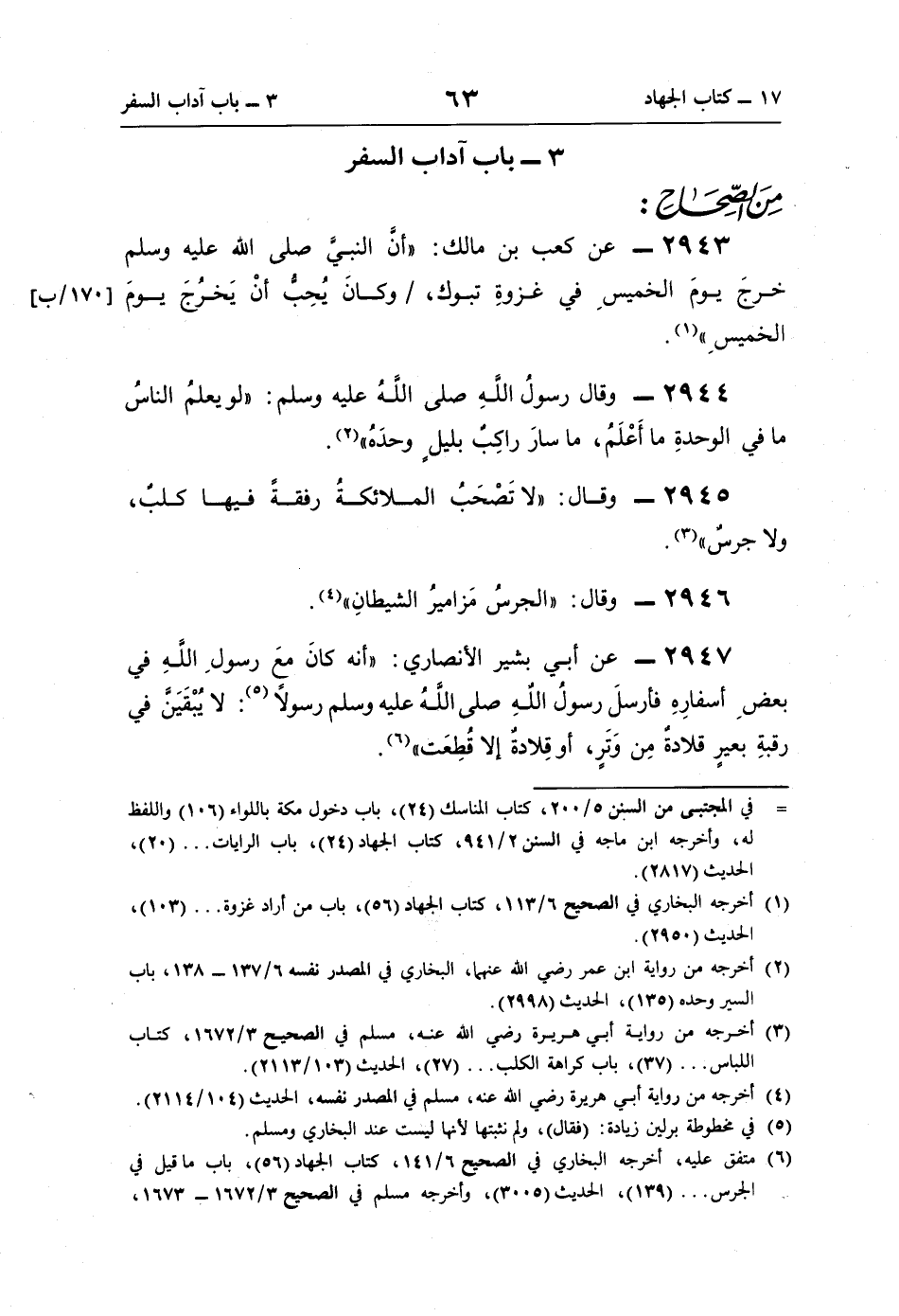(¬6) متفق عليه، أخرجه البخاري في الصحيح 6/ 141، كتاب الجهاد (56)، باب ما قيل في الجرس. . . (139)، الحديث (3005)، وأخرجه مسلم في الصحيح 3/ 1672 - 1673، =
