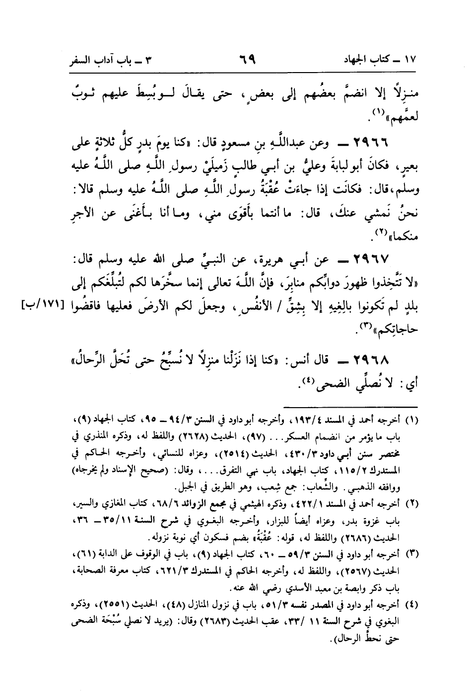 (¬4) أخرجه أبو داود في المصدر نفسه 3/ 51، باب في نزول المنازل (48)، الحديث (2551)، وذكره البغوي في شرح السنة 11/ 33، عقب الحديث (2683) وقال: (يريد لا نصلي سُبْحَة الضحى حتَّى نحطَّ الرحال).