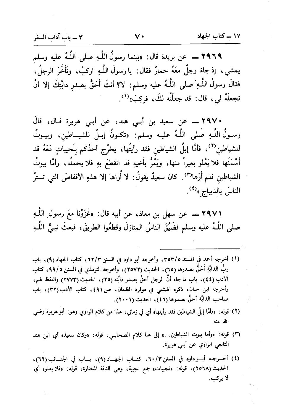(¬4) أخرجه أبو داود في السنن 3/ 60، كتاب الجهاد (9)، باب في الجنائب (62)، الحديث (2568)، قوله: "نجيبات" جمع نجيبة، وهي الناقة المختارة، قوله: "فلا يعلو" أي لا يركب.