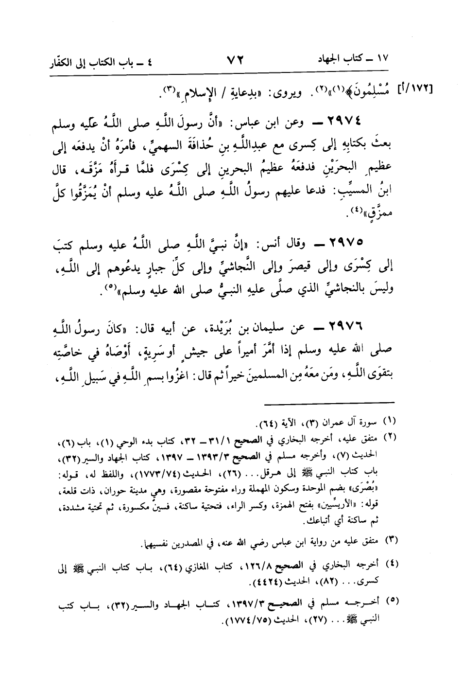 (¬5) أخرجه مسلم في الصحيح 3/ 1397، كتاب الجهاد والسير (32)، باب كتب النَّبِيّ -صلى اللَّه عليه وسلم-. . . (27)، الحديث (75/ 1774).