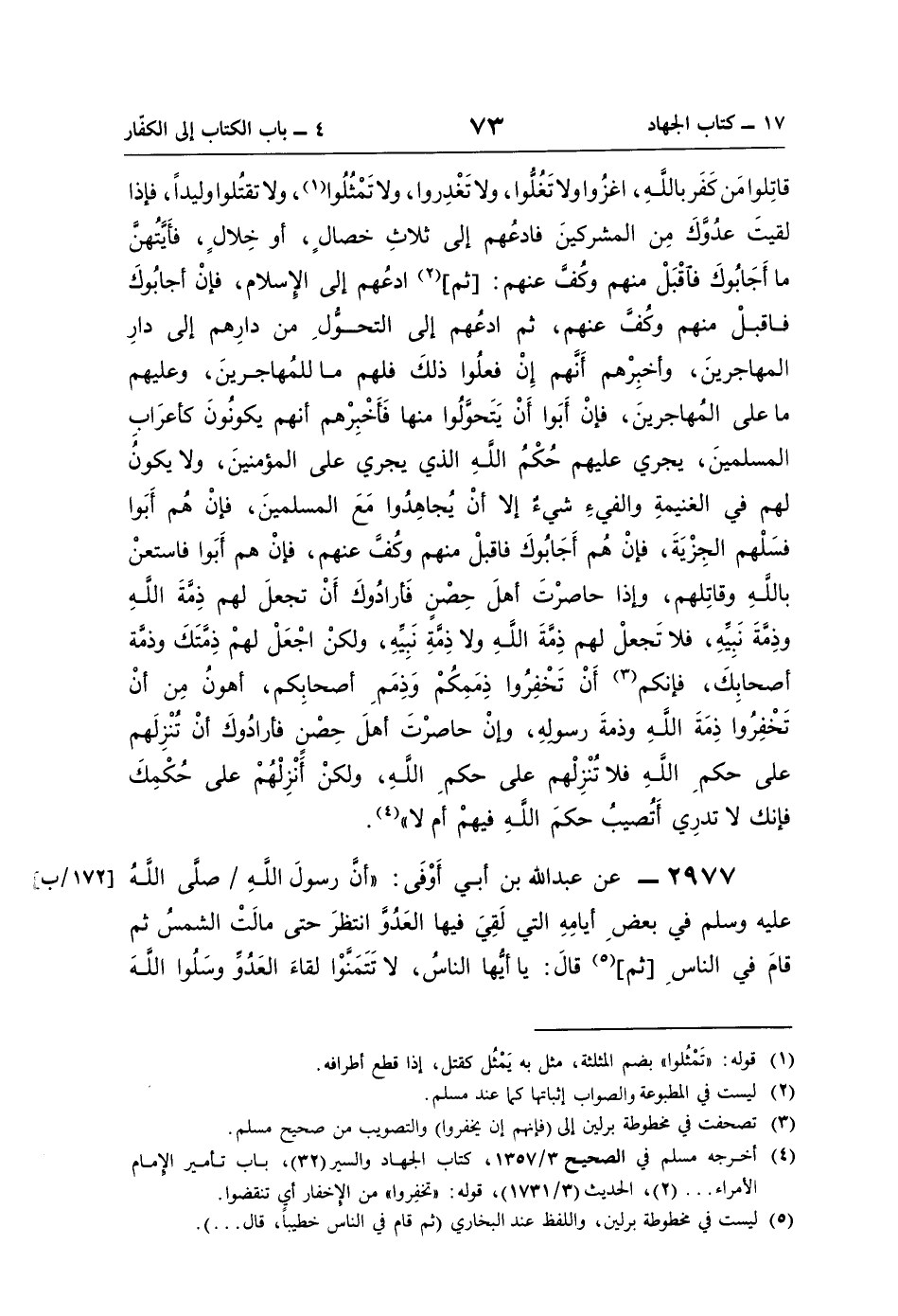 2977 - عن عبد اللَّه بن أبي أَوْفَى: "أنَّ رسولَ اللَّهِ صلَّى اللَّهُ عليه وسلم في بعضِ أيامِهِ التي لَقِيَ فيها العَدُوَّ انتظرَ حتَّى مالَتْ الشَّمْسُ ثم قامَ في الناسِ [ثم] (¬5) قالَ: يَا أيُّها النَّاسُ، لا تَتَمَنَّوْا لقاءَ العَدُوِّ وسَلُوا اللَّهَ