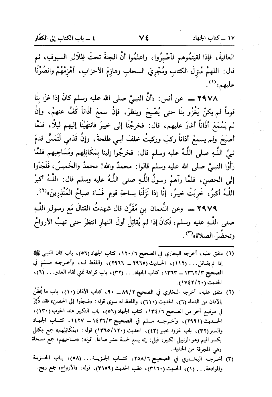 2978 - عن أنس: "أنَّ النبيَّ صلى اللَّه عليه وسلم كانَ إذا غزَا بِنَا قومًا لم يكنْ يَغْزُو بنَا حتَّى يُصْبحَ وينظرَ، فإنْ سمعَ أذَانًا كَفَّ عنهمْ، وإنْ لم يَسْمَعَ أذَانًا أغارَ عليهم، قال: فخرجْنَا إلى خيبرَ فانتهَيْنَا إليهم ليلًا، فلمَّا أصبَحَ ولم يسمعْ أذانًا ركبَ وركبتُ خلفَ أبي طلحةَ، وإن قَدَمي لَتَمَسُّ قدمَ نبيِّ اللَّه صلى اللَّهُ عليه وسلم قال: فخرجُوا إلينا بِمَكَاتِلِهم ومَسَاحِيهم فلمَّا رَأَوْا النَّبِيَّ صلى اللَّه عليه وسلم قالوا: محمدٌ واللَّه! محمدٌ والخَميسُ، فَلَجَأوا إلى الحصنِ، فلمَّا رآهمُ رسولُ اللَّهِ صلى اللَّهُ عليه وسلم قال: اللَّه أكبرُ اللَّهُ أكبرُ، خَرِبَتْ خيبرُ، إنَّا إذا نَزَلْنَا بساحةِ قومٍ فَسَاءَ صباحُ المُنْذِرِينَ" (¬2).