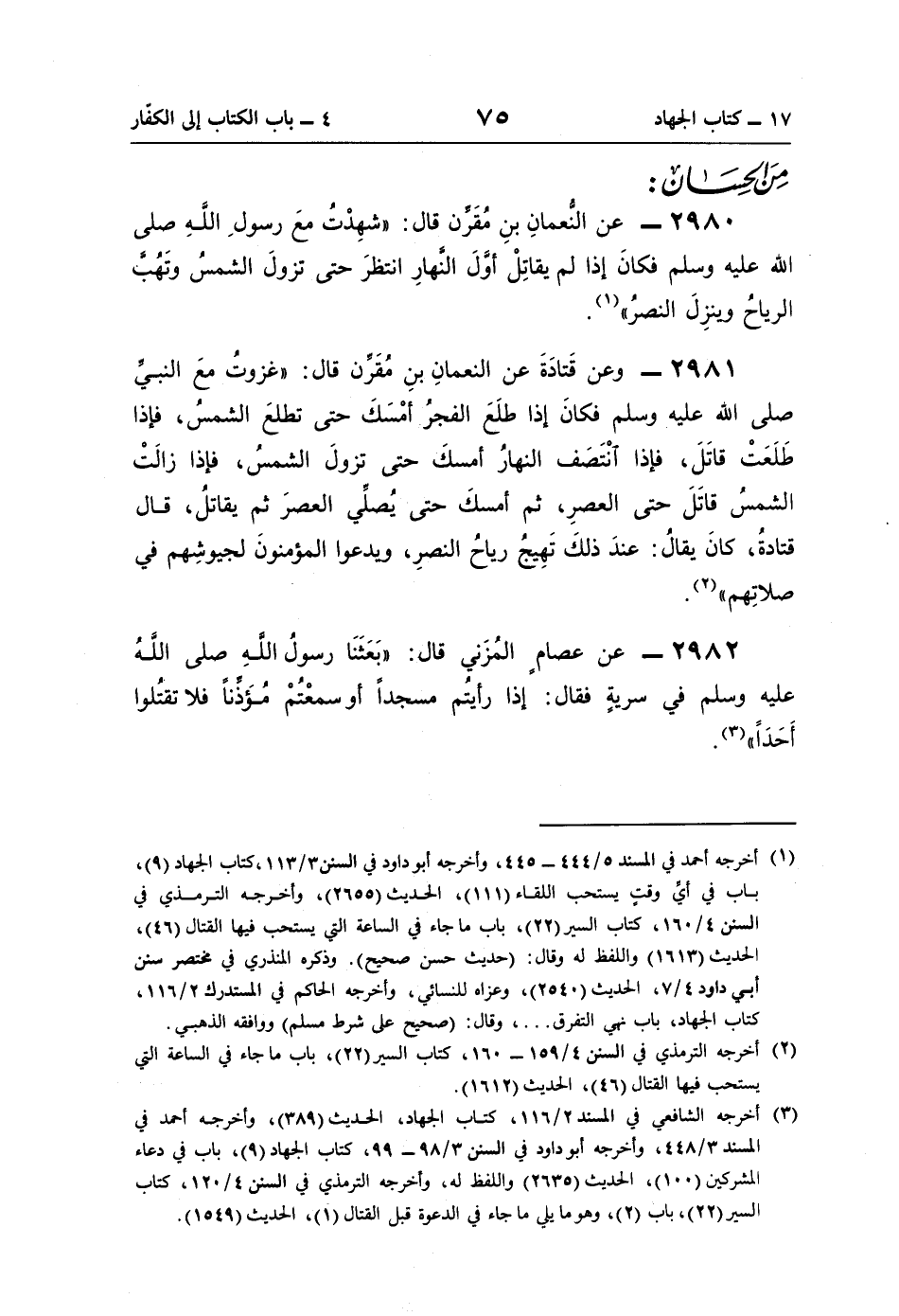 2981 - وعن قَتادَةَ عن النعمانِ بنِ مُقَرِّن قال: "غزوتُ معَ النَّبِيّ صلى اللَّه عليه وسلم فكانَ إذا طلَعَ الفجرُ أمْسَكَ حتَّى تطلعَ الشَّمْسُ، فإذا طَلَعَتْ قاتَلَ، فإذا انْتَصَف النَّهارُ أمسكَ حتَّى تزولَ الشَّمْسُ، فإذا زالَتْ الشَّمْسُ قاتَلَ حتَّى العصرِ، ثمَّ أمسكَ حتَّى يُصلِّي العصرَ ثم يقاتلُ، قال قتادةُ، كانَ يقالُ: عندَ ذلكَ تَهِيجُ رياحُ النصرِ، ويدعوا المؤمنونَ لجيوشِهم في صلاتِهم" (¬2).