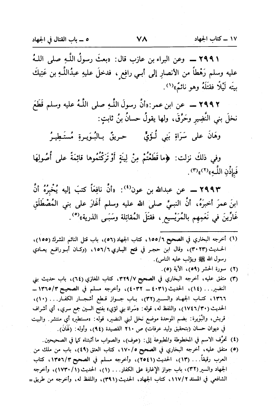 (¬3) متفق عليه، أخرجه البخاري في الصحيح 7/ 329، كتاب المغازي (64)، باب حديث بني النضير. . . (14)، الحديث (4031 - 4032)، وأخرجه مسلم في الصحيح 3/ 1365 - 1366، كتاب الجهاد والسير (32)، باب جواز قطع أشجار الكفار. . . (10)، الحديث (30/ 1746)، واللفظ له، قوله: "سَراة بني لؤي" بفتح السين جمع سري، أي أشراف قريش، والبُوَيرة: بضم الموحدة موضع نخل لبني النضير، قوله: "مستطير" أي منتشر. والبيت في ديوان حسان (بتحقيق وليد عرفات) ص 210 القصيدة (94)، وأوله: (لَهَانَ).