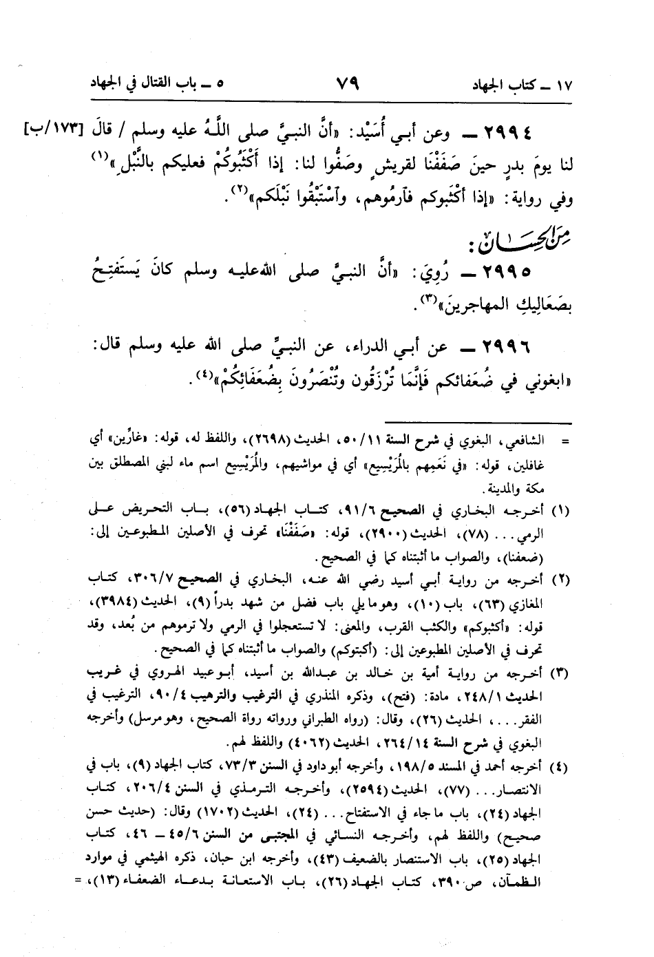 (¬2) أخرجه من رواية أبي أسيد رضي اللَّه عنه، البخاري في الصحيح 7/ 306، كتاب المغازي (63)، باب (10)، وهو ما يلي باب فضل من شهد بدرًا (9)، الحديث (3984)، قوله: "أكثبوكم" والكثب القرب، والمعنى: لا تستعجلوا في الرمي ولا ترموهم من بُعد، وقد تحرف في الأصلين المطبوعين إلى: (أكبتوكم) والصواب ما أثبتناه كما في الصحيح.