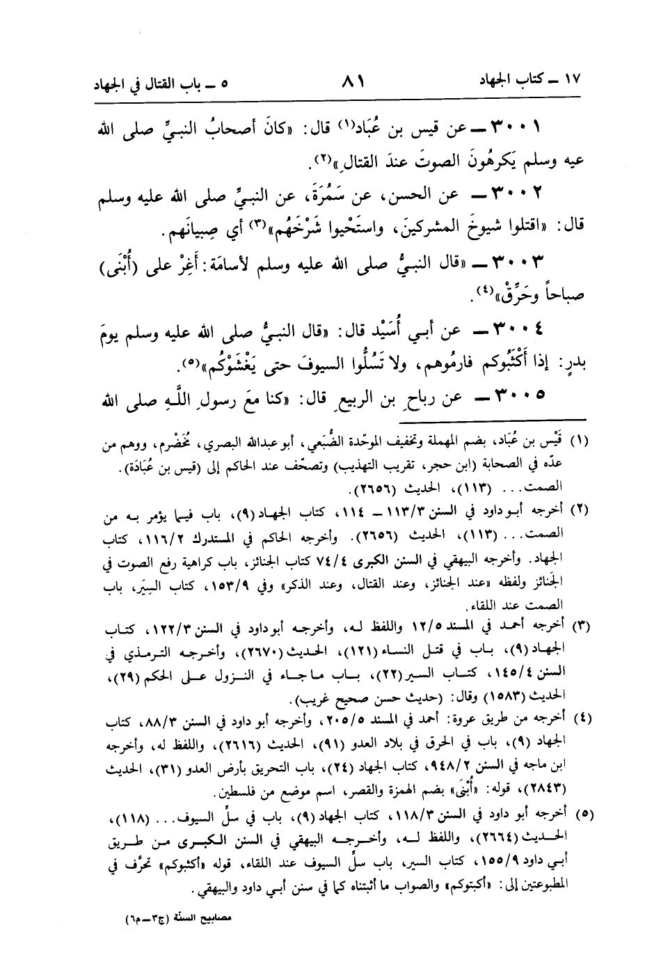 3001 - عن قيس بن عُبَاد (¬1) قال: "كانَ أصحابُ النَّبيِّ صلى اللَّه عيه وسلم يَكرهُونَ الصوتَ عندَ القتالِ" (¬2).