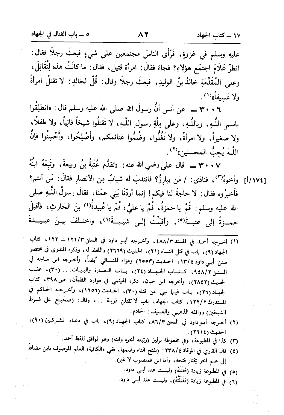 (¬1) أخرجه أحمد في المسند 3/ 488، وأخرجه أبو داود في السنن 3/ 121 - 122، كتاب الجهاد (9)، باب في قتل النساء (21)، الحديث (2669) واللفظ له، وذكره المنذري في مختصر سنن أبي داود 4/ 13، الحديث (2553) وعزاه للنسائي أَيضًا، وأخرجه ابن ماجه في السنن 2/ 948، كتاب الجهاد (24)، باب الغارة والبيات. . . (30)، عقب الحديث (2842)، وأخرجه ابن حبان، ذكره الهيثمي في موارد الظمآن، ص 398، كتاب الجهاد (26)، باب فيما نهي عن قتله (30)، الحديث (1656)، وأخرجه الحاكم في المستدرك 2/ 122، كتاب الجهاد، باب لا تقتلن ذرية. . .، وقال: (صحيح على شرط الشيخين) ووافقه الذهبي والعسيف: الخادم.