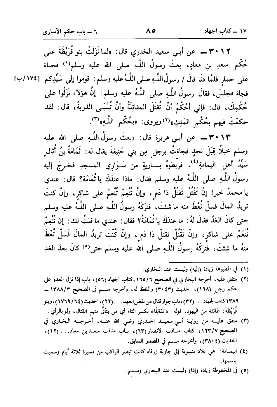 3012 - عن أبي سعيد الخُدرِي قال: "لما نَزَلَتْ بنو قُرَيْظَةَ على حُكْمِ سعدِ بنِ معاذٍ، بعثَ رسولُ اللَّهِ صلى اللَّه عليه وسلم (¬1) فجاءَ على حمارٍ فلمَّا دَنَا قالَ رسولُ اللَّه صلى اللَّهُ عليه وسلم: قوموا إلى سَيِّدِكم فجاءَ فجلسَ، فقالَ رسولُ اللَّهِ صلى اللَّه عليه وسلم: إنَّ هؤلاء نَزَلُوا على حُكْمِكَ، قال: فإنِّي أَحْكُمُ أنْ نُقتَلَ المقاتِلَةُ وأنْ تُسْبَى الذريةُ، قال: لقد حكمْتَ فيهم بحُكْمِ المَلِكِ" (¬2) ويروى: "بحُكْمِ اللَّهِ" (¬3).