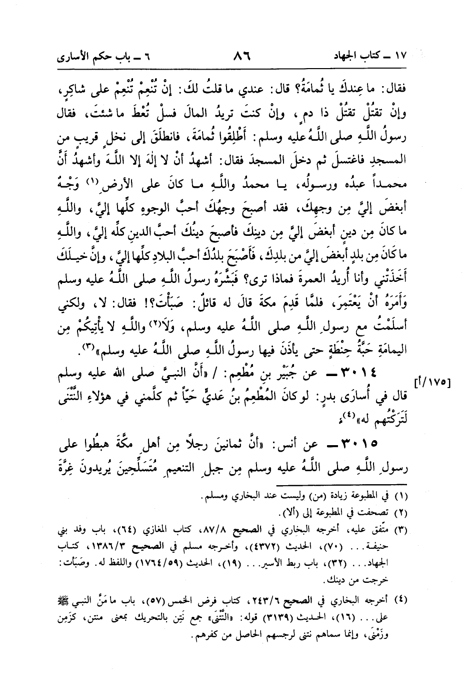 (¬3) متّفق عليه، أخرجه البخاري في الصحيح 8/ 87، كتاب المغازي (64)، باب وقد بني حنيفة. . . (70)، الحديث (4372)، وأخرجه مسلم في الصحيح 3/ 1386، كتاب الجهاد. . . (32)، باب ربط الأسير. . . (19)، الحديث (59/ 1764) واللفظ له. وصَبَأت: خرجت من دينك.