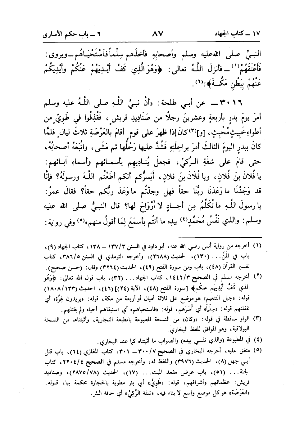 3016 - عن أبي طلحة: "أنَّ نبيَّ اللَّهِ صلى اللَّهُ عليه وسلم أمرَ يومَ بدرٍ بأربعةٍ وعشرينَ رجلًا من صَنَادِيدِ قريشٍ، فَقُذِفوا في طَوِيٍّ من أطواءِ خَبِيثٍ مُخْبِثٍ، [و] (¬3) كانَ إذا ظهرَ على قومٍ أقامَ بالعَرْصَةِ ثلاثَ ليالٍ فلمَّا كانَ ببدرٍ اليومَ الثالثَ أمرَ براحِلَتِهِ فَشُدَّ عليها رَحْلُها ثم مَشَى، واتَّبَعَهُ أصحابُهُ، حتَّى قامَ على شفَةِ الرَّكيِّ، فجعلَ يُنَادِيهِم بأسمائهم وأسماءِ آبائهم: يَا فُلانَ بنَ فُلانٍ، ويا فُلَانَ بنَ فلانٍ، أَيَسرُّكم أنكم أطَعْتُم اللَّهَ ورسولَهُ؟ فإنَّا قد وَجَدْنَا ما وَعَدَنَا ربُّنَا حقًّا فهل وجدْتَم ما وَعَدَ ربُّكم حقًّا؟ فقالَ عمرُ: يَا رسولَ اللَّه ما تُكَلِّمُ مِن أجسادٍ لا أَرْوَاحَ لها؟ قال النَّبِيُّ صلى اللَّه عليه وسلم: والذي نَفْسُ مُحَمَّدٍ (¬4) بيدِه ما أنتُم بأسمَعَ لِمَا أقولُ منهم" (¬5) وفي رواية: