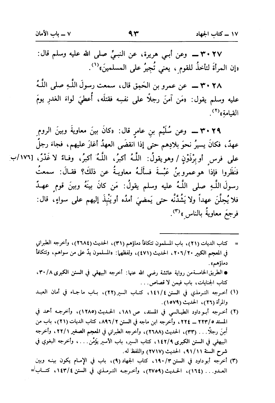 3029 - وعن سُلَيْم بنِ عامرٍ قال: "كانَ بينَ معاويةَ وبينَ الرومِ عهدٌ، فكانَ يسيرُ نحوَ بلادِهم حتَّى إذا انقضَى العهدُ أغارَ عليهم، فجاءَ رجلٌ على فرسٍ أو بِرْذَوْنٍ وهو يقولُ: اللَّهُ أكبرُ، اللَّهُ أكبرُ، وفاءٌ لا غَدْرٌ، فنَظَروا فإذا هو عمرو بنُ عَبْسةَ فسأَلَهُ معاويةُ عن ذلكَ؟ فقالَ: سمعتُ رسولَ اللَّهِ صلى اللَّهُ عليه وسلم يقولُ: مَن كانَ بينَهُ وبينَ قومٍ عهدٌ فلا يُحِلَّنَ عهدًا ولا يَشُدَّنَّه حتَّى يَمضيَ أمدُه أو يَنْبِذَ إليهم على سواءٍ، قال: فرجعَ معاويةُ بالناسِ" (¬3).