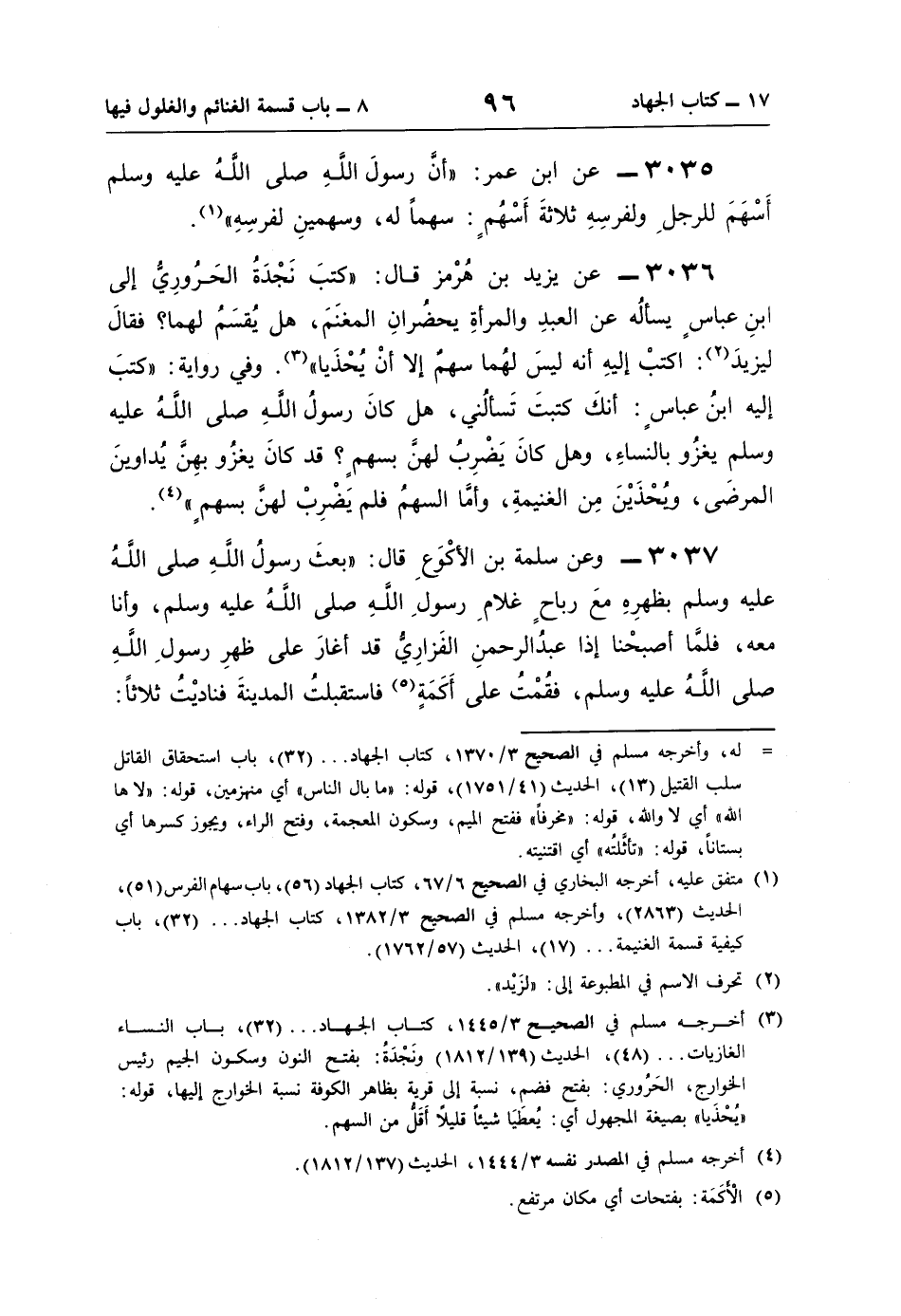(¬3) أخرجه مسلم في الصحيح 3/ 1445، كتاب الجهاد. . . (32)، باب النساء الغازيات. . . (48)، الحديث (139/ 1812) ونَجْدَةُ: بفتح النون وسكون الجيم رئيس الخوارج، الحَرُوري: بفتح فضم، نسبة إلى قرية بظاهر الكوفة نسبة الخوارج إليها، قوله: "يُحْذَيا" بصيغة المجهول أي: يُعطَيَا شيئًا قليلًا أَقَلُّ من السهم.