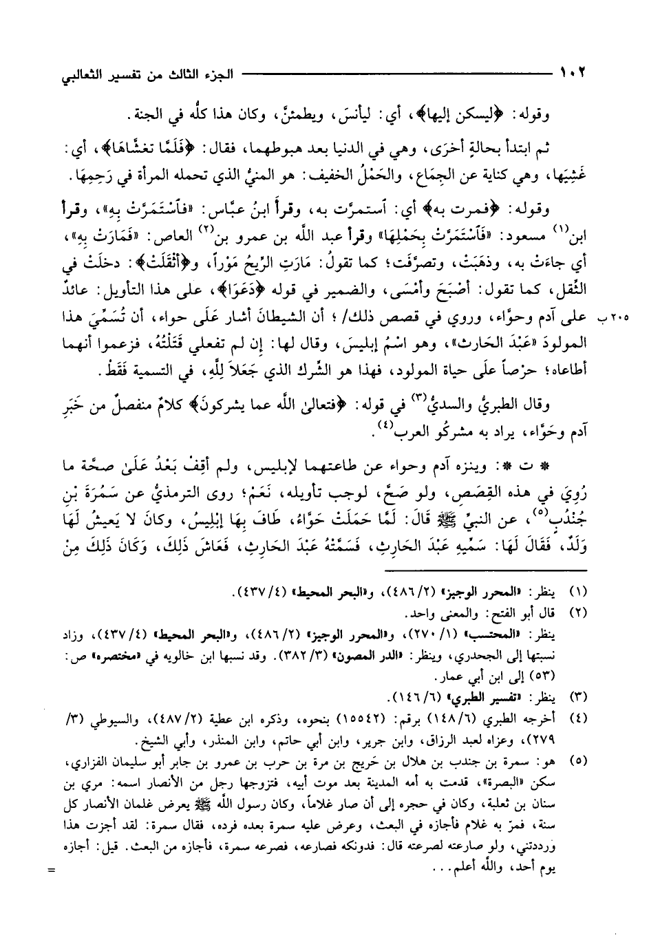 ت: وينزه آدم وحواء عن طاعتهما لإبليس، ولم أقِفْ بَعْدُ على صحَّة ما رُوِيَ في هذه القِصَصِ، ولو صَحَّ، لوجب تأويله، نَعَمْ روى الترمذيُّ عن سَمُرَةَ بْنِ جُنْدُبٍ «5» ، عن النبيّ صلّى الله عليه وسلّم قَالَ: لَمَّا حَمَلَتْ حَوَّاءُ، طَافَ بِهَا إبْلِيسُ، وكانَ لا يَعيشُ لَهَا وَلَدٌ، فَقَالَ لَهَا: سَمِّيهِ عَبْدَ الحَارِثِ، فَسَمَّتْهُ عَبْدَ الحَارِثِ، فَعَاشَ ذلك، وكان ذلك من